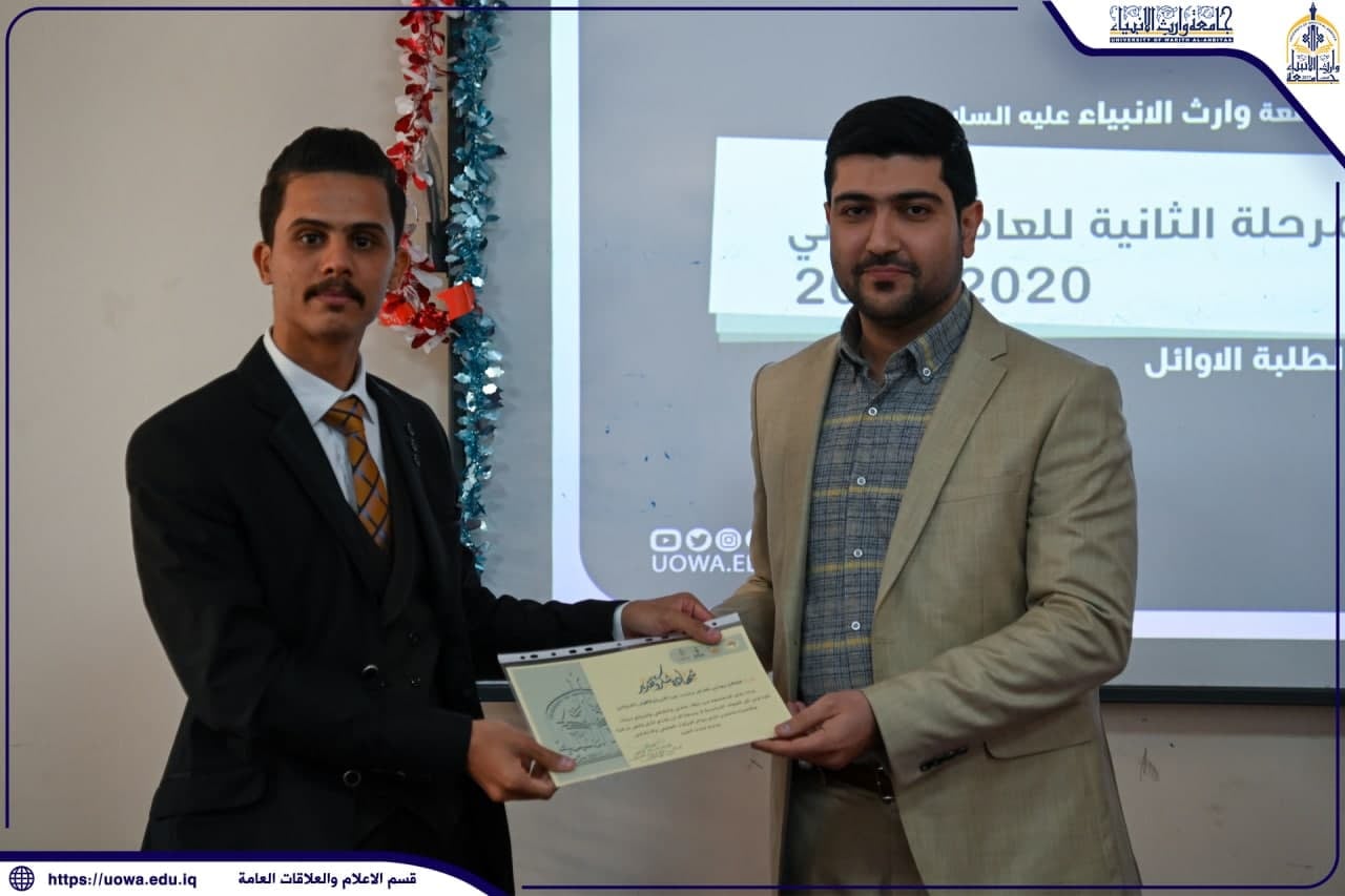 احتفت عمادة كلية القانون في جامعة وارث الانبياء (عليه السلام) بطلبتها الأوائل ولكلا الدراستين الصباحية والمسائية، وذلك عبر تقديم شهادات الشكر والتقدير و الهدايا التشجيعية تثميناً لجدهم واجتهادهم ولتحفيز بقية الطلبة للمزيد من الاجتهاد العلمي .