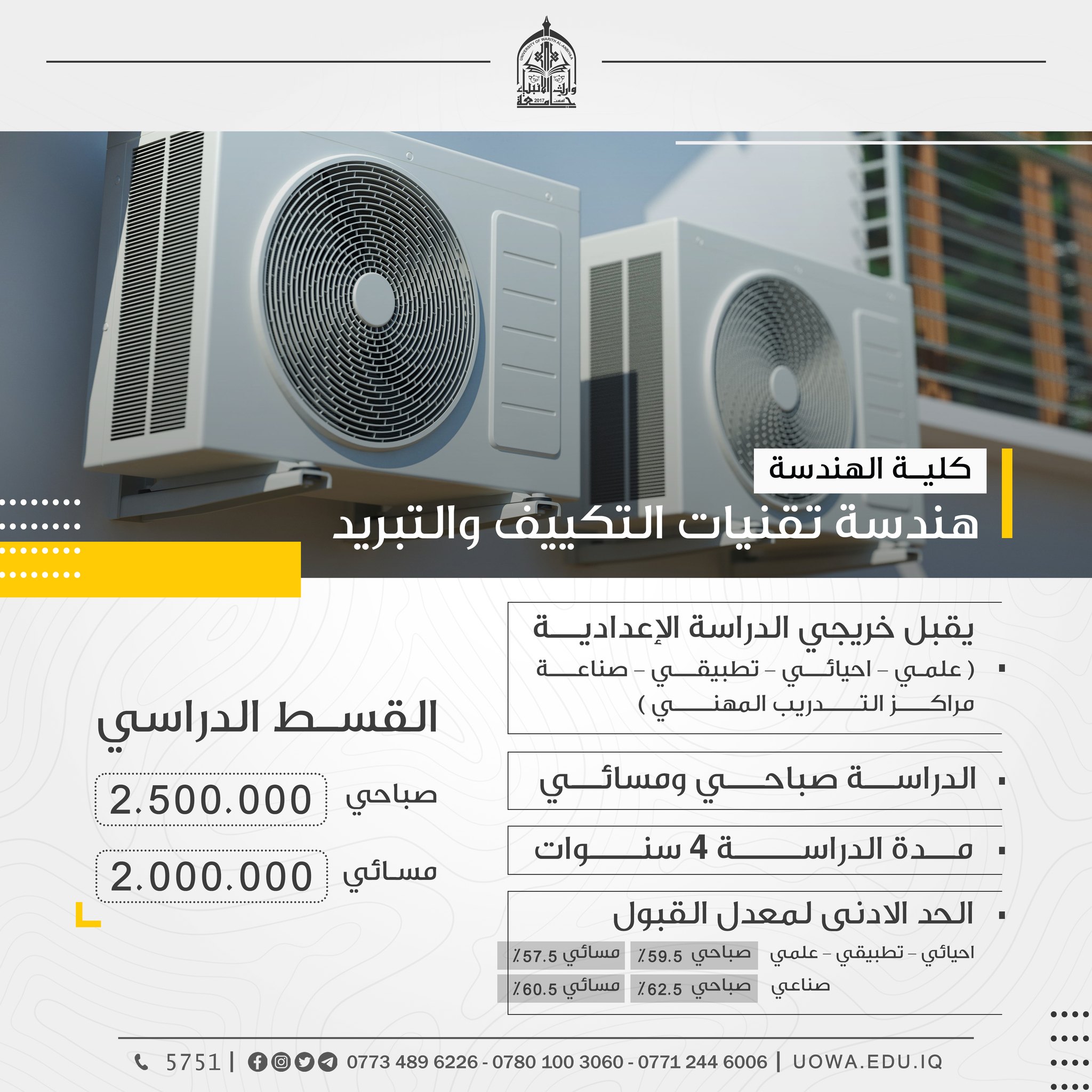 (عدا كلية الطب) اعزاءنا الطلبة الراغبين بالتسجيل في كليات واقسام جامعة وارث الانبياء(عليه السلام) (عدا كلية الطب) مراجعة الجامعة ابتداءً من السبت، إذ سيكون فريق التسجيل بانتظاركم من الساعة( ٨ ) صباحاً ولغاية( ٥ ) مساءً