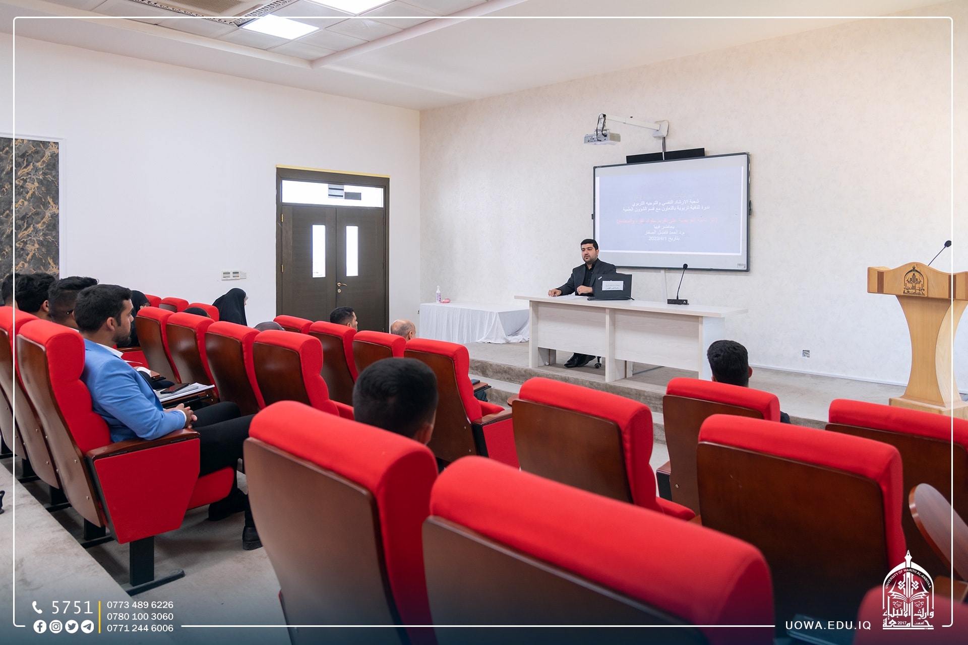 ندوة ثقافية تربوية بعنوان (اثر تأدية الفريضة على سلوك الفرد والمجتمع) اقامتها شعبة الارشاد النفسي والتوجيه التربوي بالتعاون مع قسم الشؤون العلمية ، قدمها المدرس الدكتور احمد الصفار.