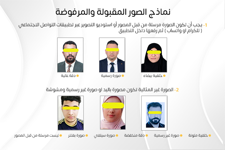 يجب أن تكون الصورة مرسلة من قبل المصور أو استوديو التصوير عبر تطبيقات التواصل الاجتماعي (تليكرام، واتساب) ومطابقة للمواصفات التالية: