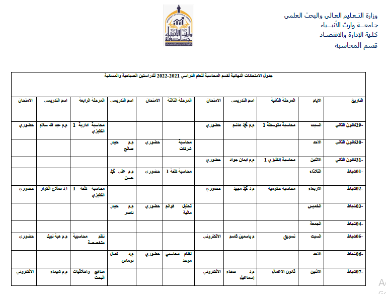 جدول الامتحانات النهائية لقسم المحاسبة للعام الدراسي 2021-2022 للدراستين الصباحية والمسائية