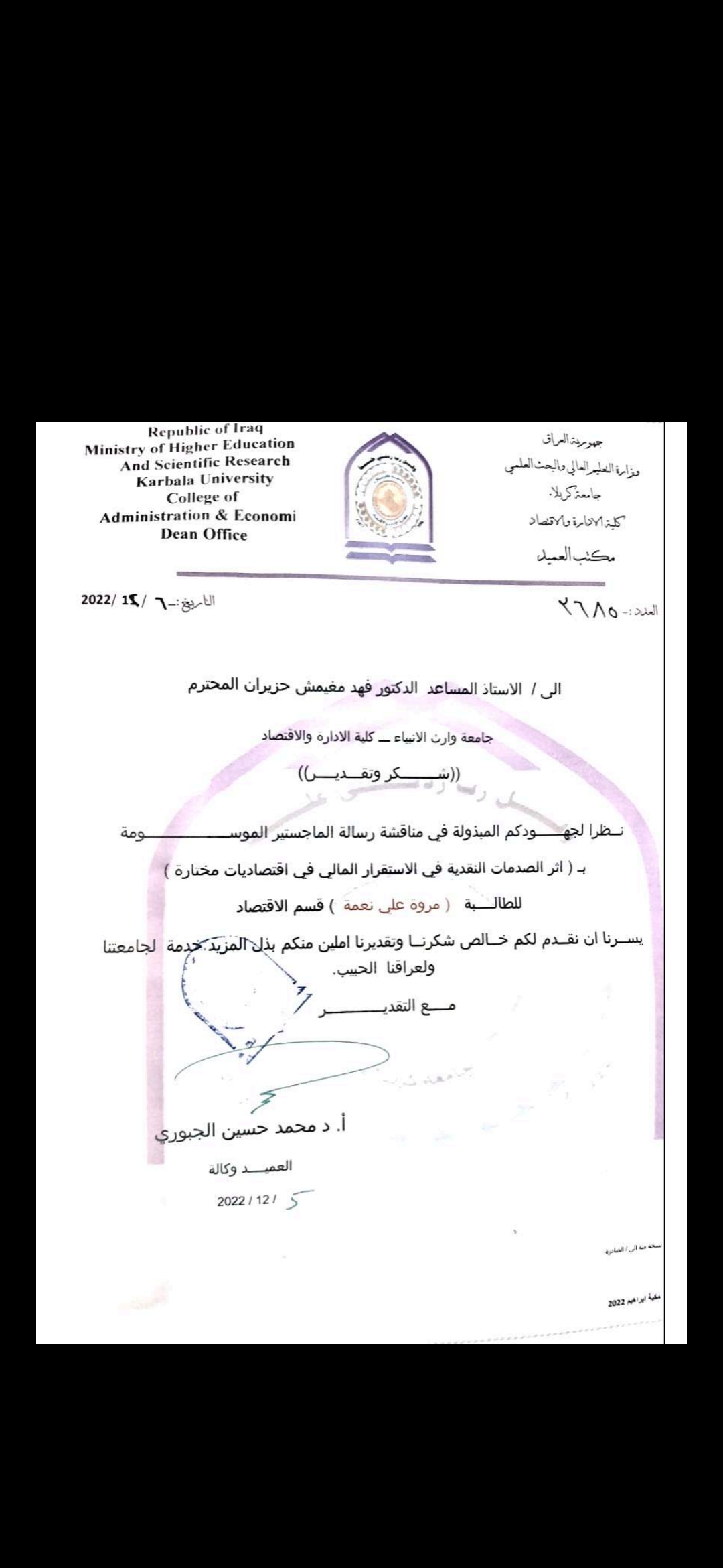 شارك الاستاذ المساعد الدكتور فهد مغيمش الشمري في عضويه ومناقشة رسالة الماجستير للطالبة مروه علي نعمه لرسالتها الموسومة (أثر الصدمات النقدية في الاستقرار المالي في اقتصادات مختارة) وذلك في يوم الثلاثاء المصادف ٦/١٢/٢٠٢٢في جامعة كربلاء كلية الإدارة والاقتصاد قسم الاقتصاد.