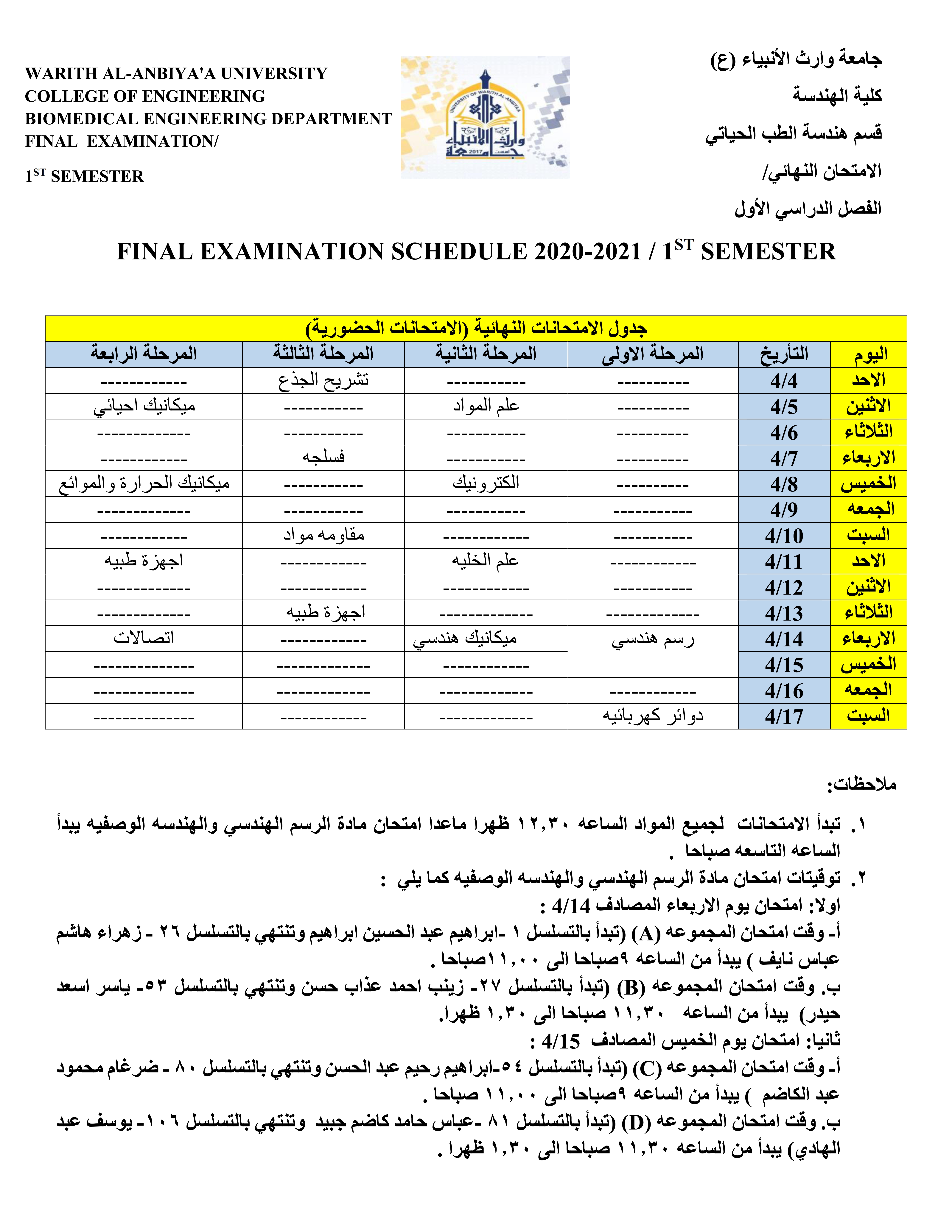 باشر طلبة قسم هندسة الطب الحياتي في كُلْيَة الهندسة امتحاناتهم الحضورية و التي تعتبر متممه للأمتحانات الإلكترونية وسط اجراءات وقائية عالية للحماية من انتشار فيروس كورونا وبمتابعة كبيرة من السادة القائمين على كُلْيَة الهندسة.