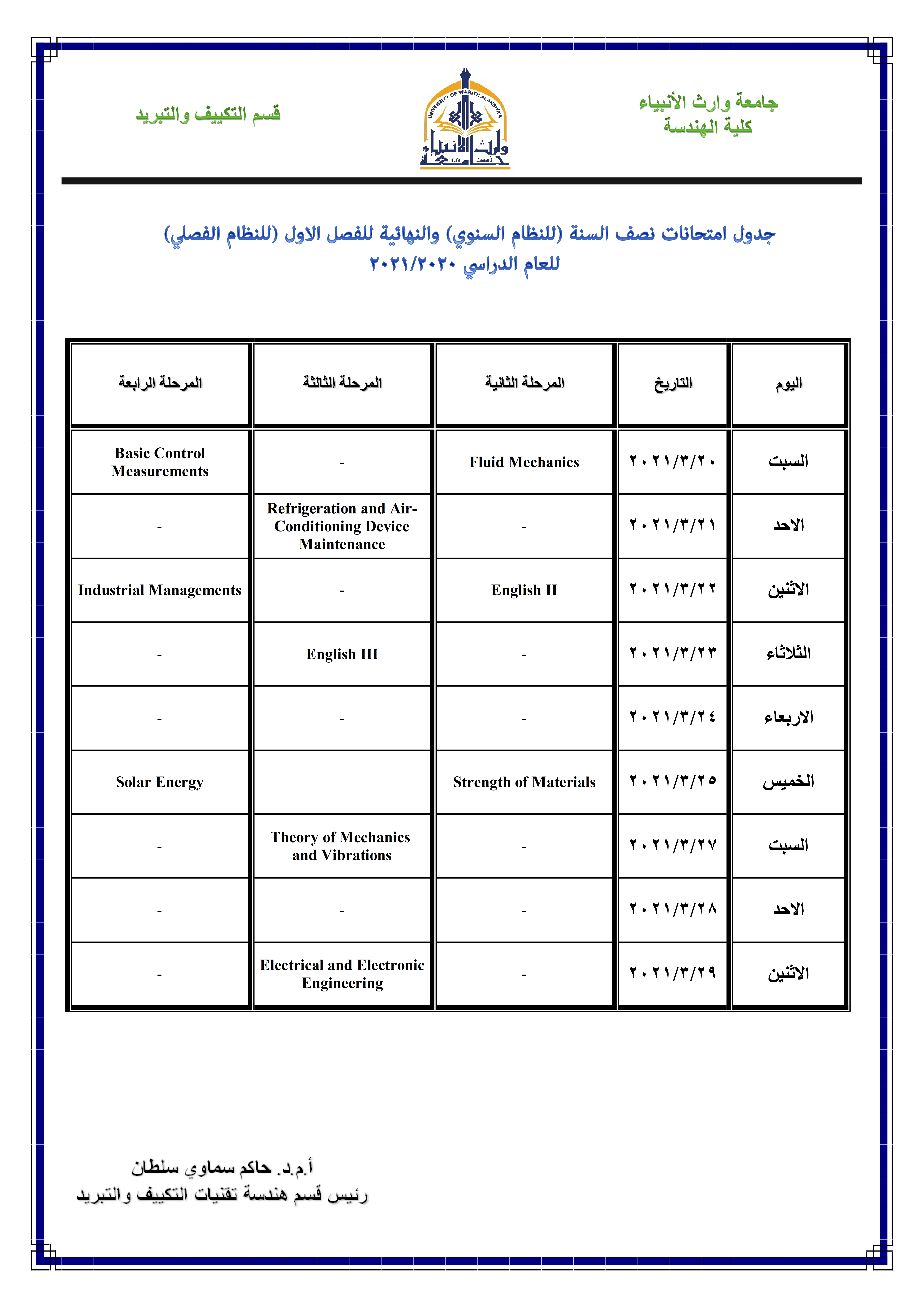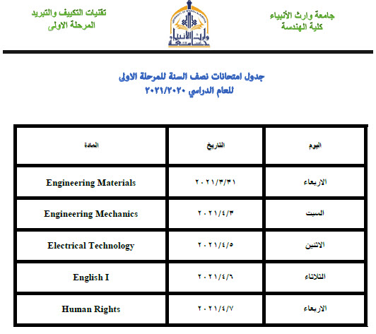 بأشراف مباشر من السيد رئيس جامعة وارث الأنبياء (ع) و متابعة مستمرة من السيد عميد كُلْيَة الهندسة و بجهود كريمة من السادة التدريسيين في كُلْيَة الهندسة، أنهى طلبة المرحلة الثانية و الثالثة و الرابعة في كُلْيَة الهندسة امتحانات الفصل الأول - الدور الأول النهائية الإلكترونية، أما الامتحانات الإلكترونية للمرحلة الأولى ستنطلق بتأريخ 31 / 3 / 2021 لتكون الامتحانات الحضورية لجميع المراحل بتأريخ 5 / 4 / 2021.
