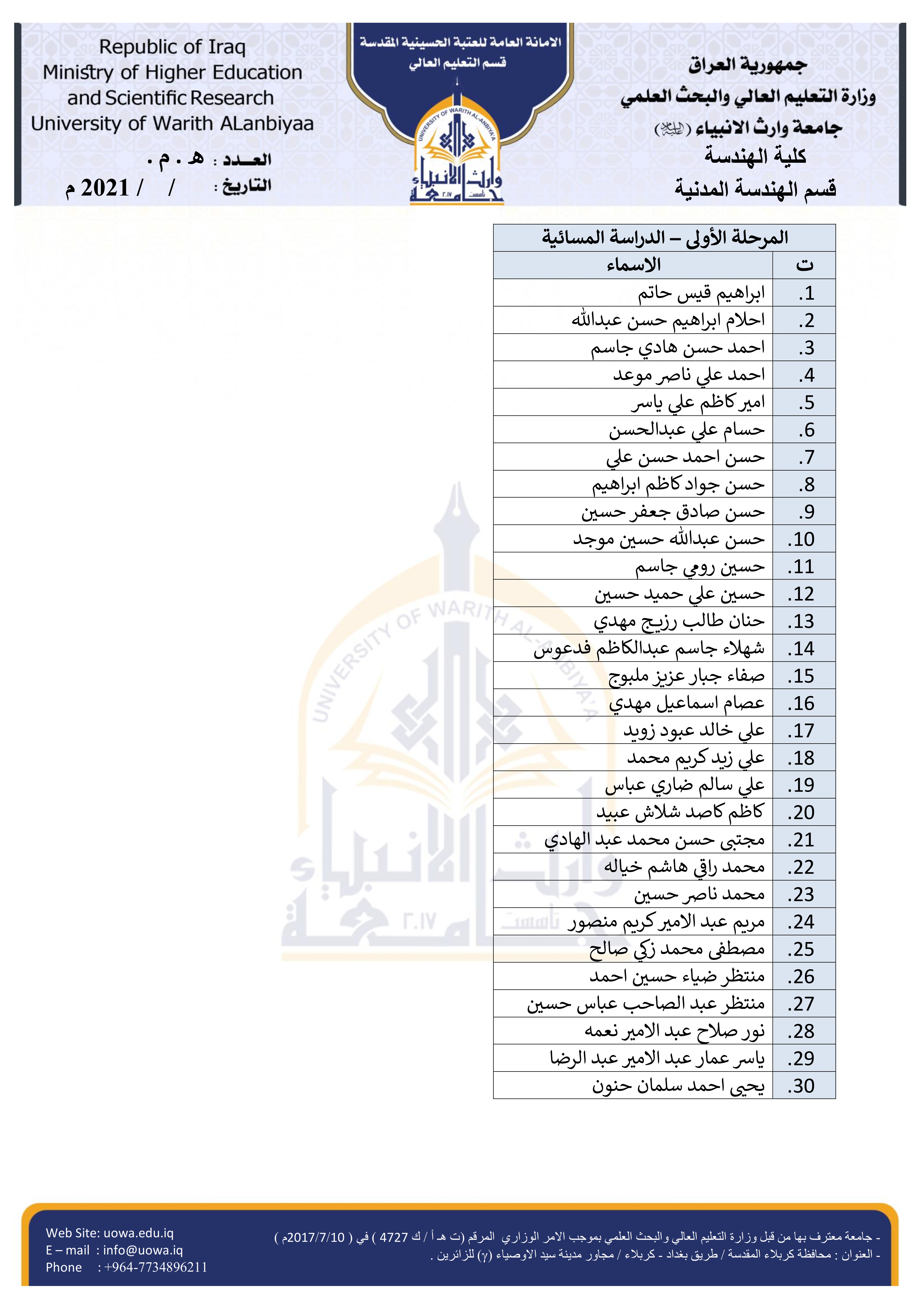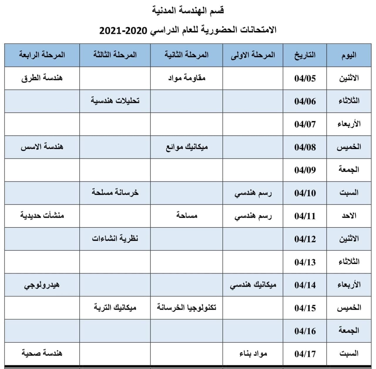 أدناه قوائم الأسماء الخاصة بالطلبة المشمولين بالامتحانات الحضورية لقسم الهندسة المدنية.
