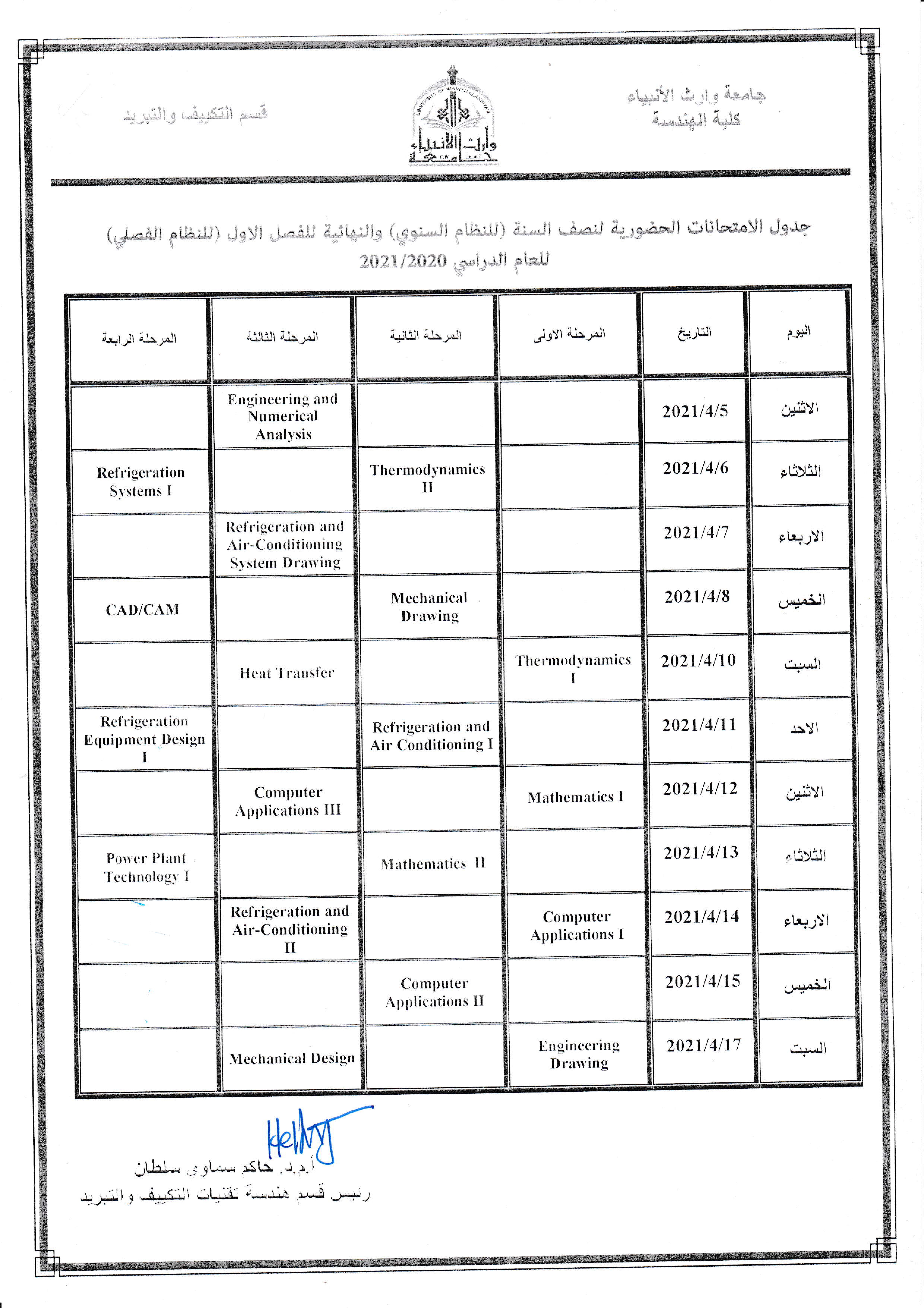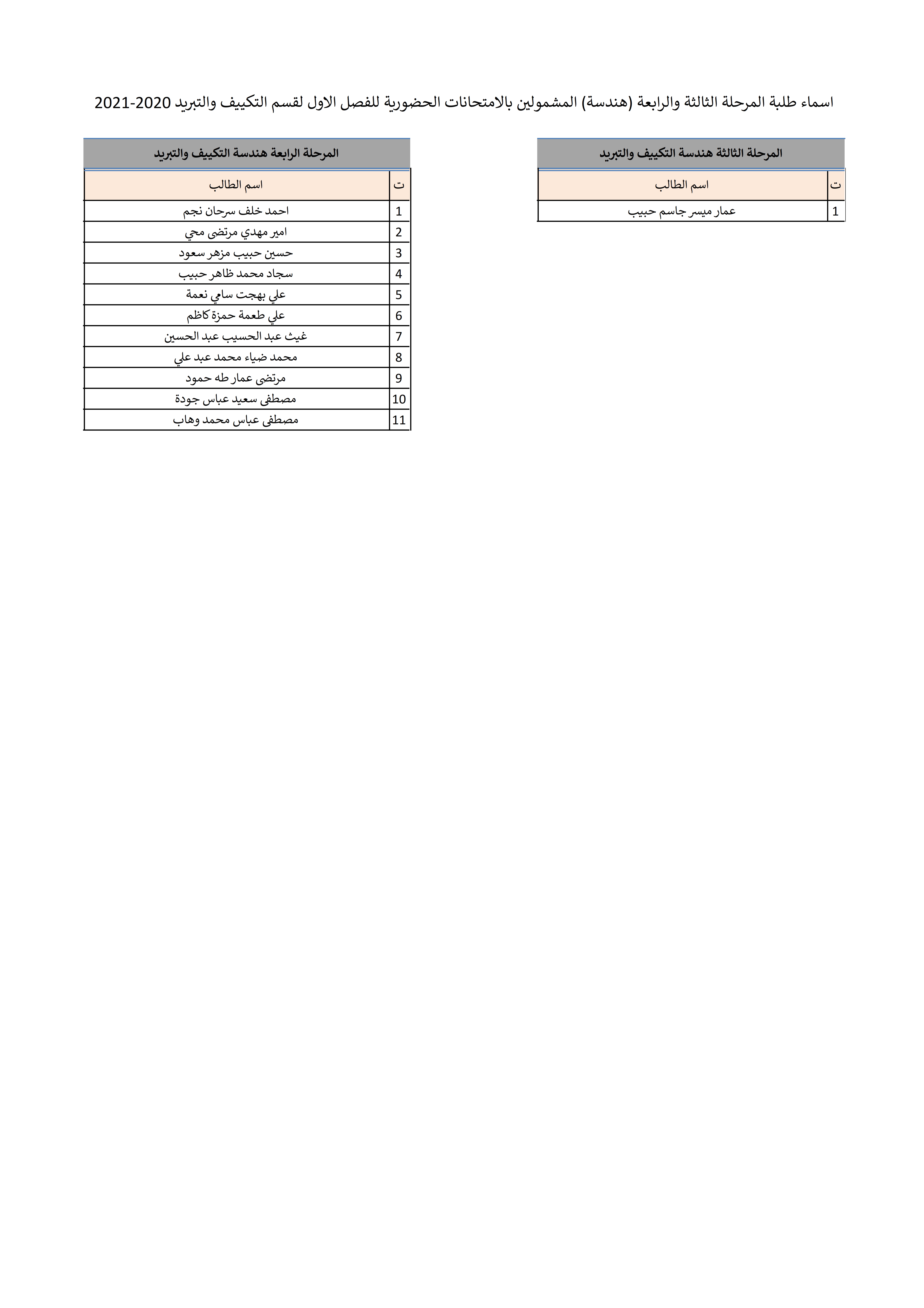 أدناه قوائم الأسماء الخاصة بالطلبة المشمولين بالامتحانات الحضورية لقسم هندسة تقنيات التكييف و التبريد.