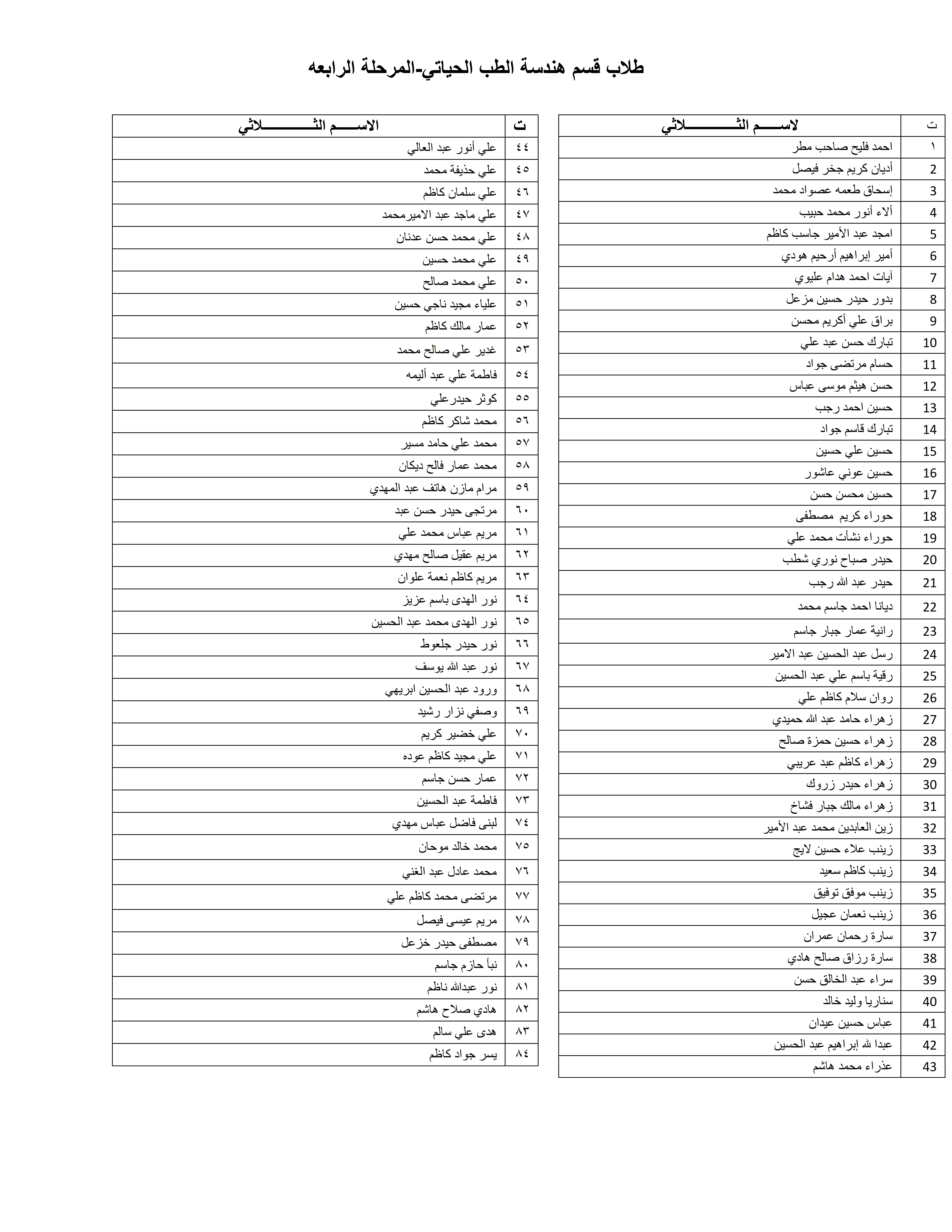 أدناه قوائم الأسماء الخاصة بالطلبة المشمولين بالامتحانات الحضورية لقسم هندسة الطب الحياتي.