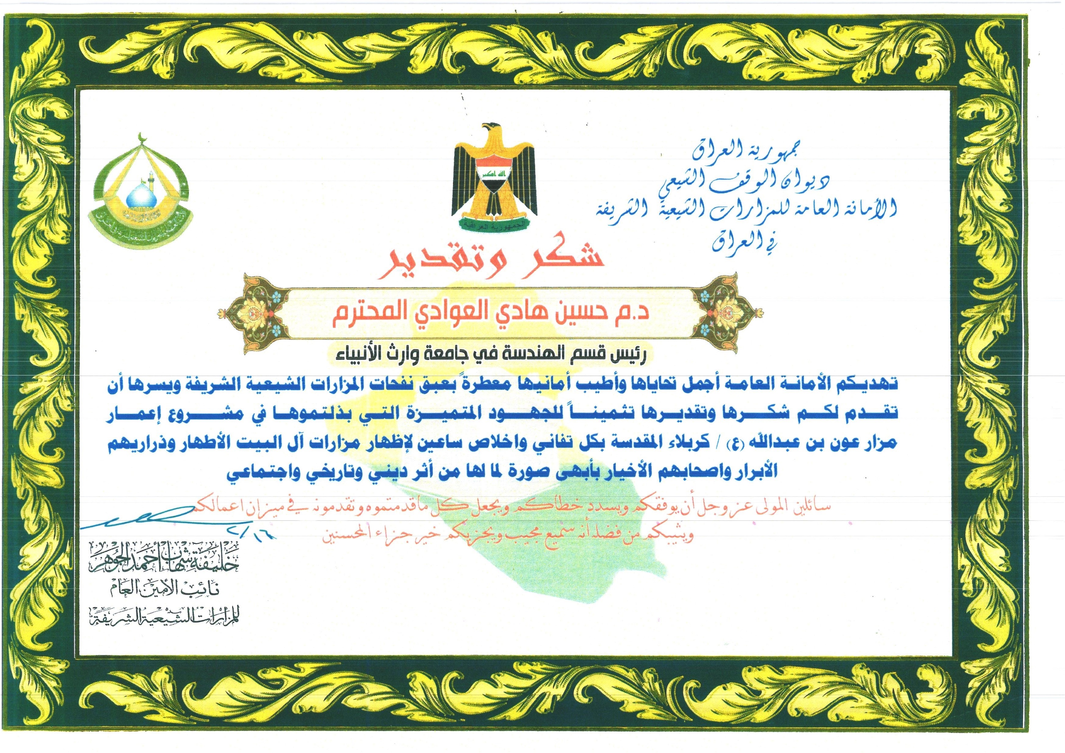 لحرصه العالي وإخلاصه بعمله اهدى نائب الأمين العام للمزارات الشيعية في العراق خليفة شهاب احمد كتاب شكر وتقدير للدكتور حسين هادي العوادي رئيس قسم الهندسه المدني في جامعة وارث الأنبياء تثمينآ للجهود المتميزة التي بذلها في مشروع إعمار مزار عون بن عبدالله(عليه السلام) ، وقال الدكتور حسين هادي عندما تم الشروع بالعمل واجه العاملين على المشروع العديد من المشاكل والتي منها مشكلة المياه الجوفية فتمت دعوتي للعمل حيث استخدمنا تقنية الركائز التي وفرت الكثير من الجهد والوقت وقضت على جميع المشاكل ووفرت أيضا مالايقل عن ملياري دينار عراقي للمزار وهو شي قليل نقدمه لعتباتنا المقدّسة ، ومن جانب اخر قدم رئيس جامعة وارث الأنبياء الأستاذ الدكتور طالب حسن موسى كتاب شكر وتقدير للدكتور حسين حيث عبر الدكتور طالب عن كتاب الشكر الذي اهدتة الأمانة العامة لهو وسام نعتز به وان مشاركته واخلاصه في المشروع لهو علامة على صدق المحبة والانتماء لآل البيت (عليهم السلام)