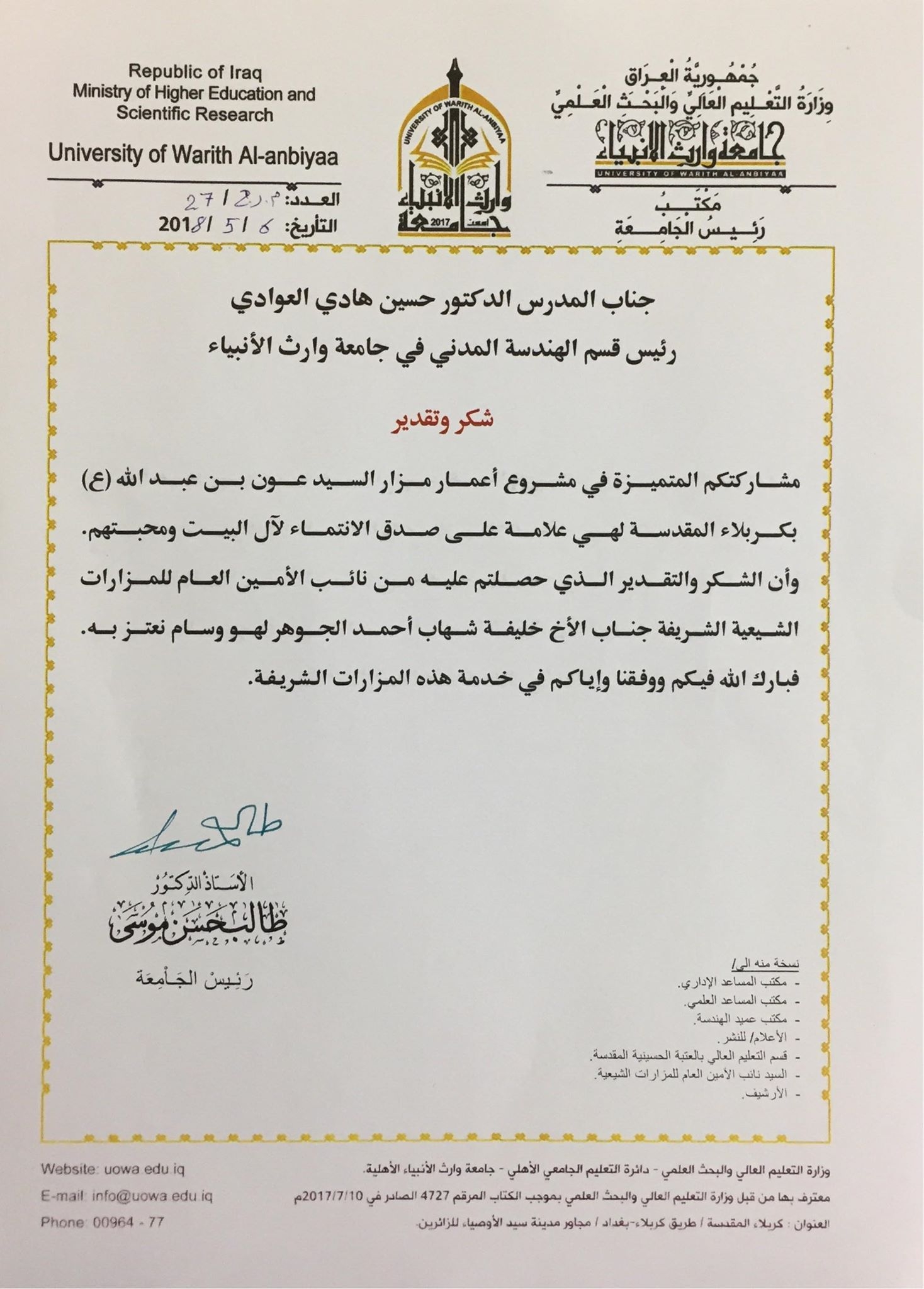 لحرصه العالي وإخلاصه بعمله اهدى نائب الأمين العام للمزارات الشيعية في العراق خليفة شهاب احمد كتاب شكر وتقدير للدكتور حسين هادي العوادي رئيس قسم الهندسه المدني في جامعة وارث الأنبياء تثمينآ للجهود المتميزة التي بذلها في مشروع إعمار مزار عون بن عبدالله(عليه السلام) ، وقال الدكتور حسين هادي عندما تم الشروع بالعمل واجه العاملين على المشروع العديد من المشاكل والتي منها مشكلة المياه الجوفية فتمت دعوتي للعمل حيث استخدمنا تقنية الركائز التي وفرت الكثير من الجهد والوقت وقضت على جميع المشاكل ووفرت أيضا مالايقل عن ملياري دينار عراقي للمزار وهو شي قليل نقدمه لعتباتنا المقدّسة ، ومن جانب اخر قدم رئيس جامعة وارث الأنبياء الأستاذ الدكتور طالب حسن موسى كتاب شكر وتقدير للدكتور حسين حيث عبر الدكتور طالب عن كتاب الشكر الذي اهدتة الأمانة العامة لهو وسام نعتز به وان مشاركته واخلاصه في المشروع لهو علامة على صدق المحبة والانتماء لآل البيت (عليهم السلام)