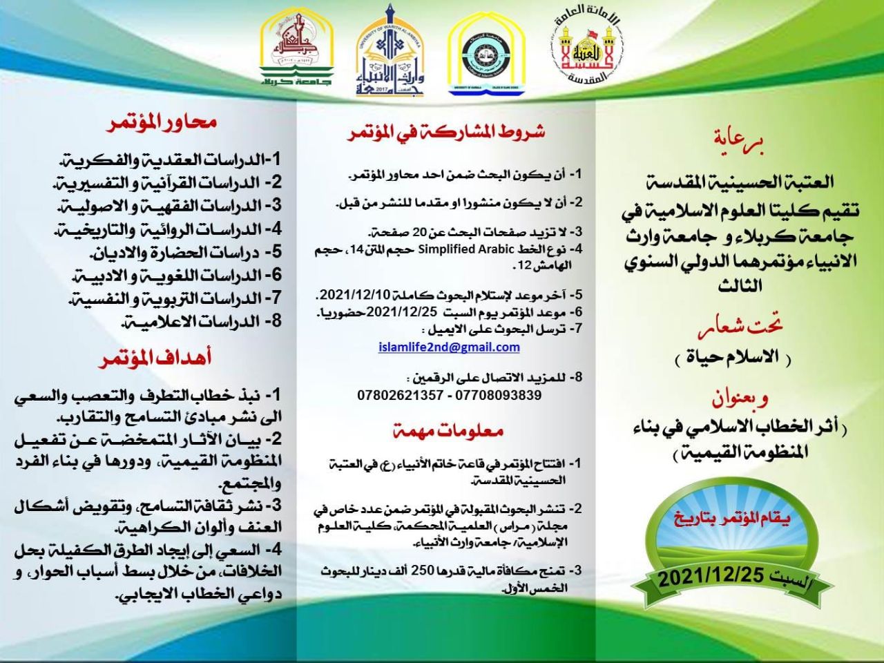 برعاية الأمانة العامة للعتبة الحسينية المقدسة تقيم كليتا العلوم الإسلامية / جامعة كربلاء وكلية العلوم الاسلامية / جامعة وارث الأنبياء مؤتمرها الدولي السنوي الثالث تحت شعار