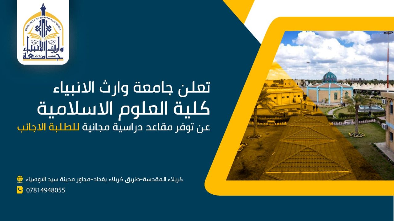 تعلن جامعة وارث الأنبياء التابعة الى العتبة الحسينية المقدسة عن توفر مقاعد دراسية مجانية للطلبة الأجانب في كلية العلوم الإسلامية لدراسة التخصصات الإسلامية وفي الاقسام العلمية