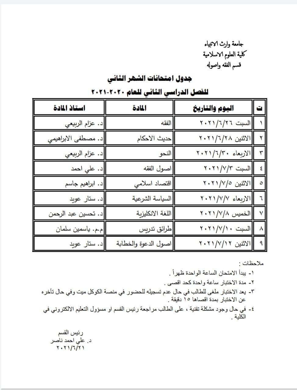حددت كلية العلوم الاسلامية في جامعة وارث الانبياء موعد انطلاق امتحانات الشهر الثاني من الفصل الدراسي الثاني للعام 2020-2021 والذي ستنطلق في السادس والعشرين من شهر حزيران وسيكون وفق اليات دقيقة بما يحقق الرصانة العلمية عند اداء الامتحانات , متمنين لطلبتنا الاعزاء دوام التوفيق والنجاح وندعوهم الى المثابرة العلمية لتحقيق النجاح.