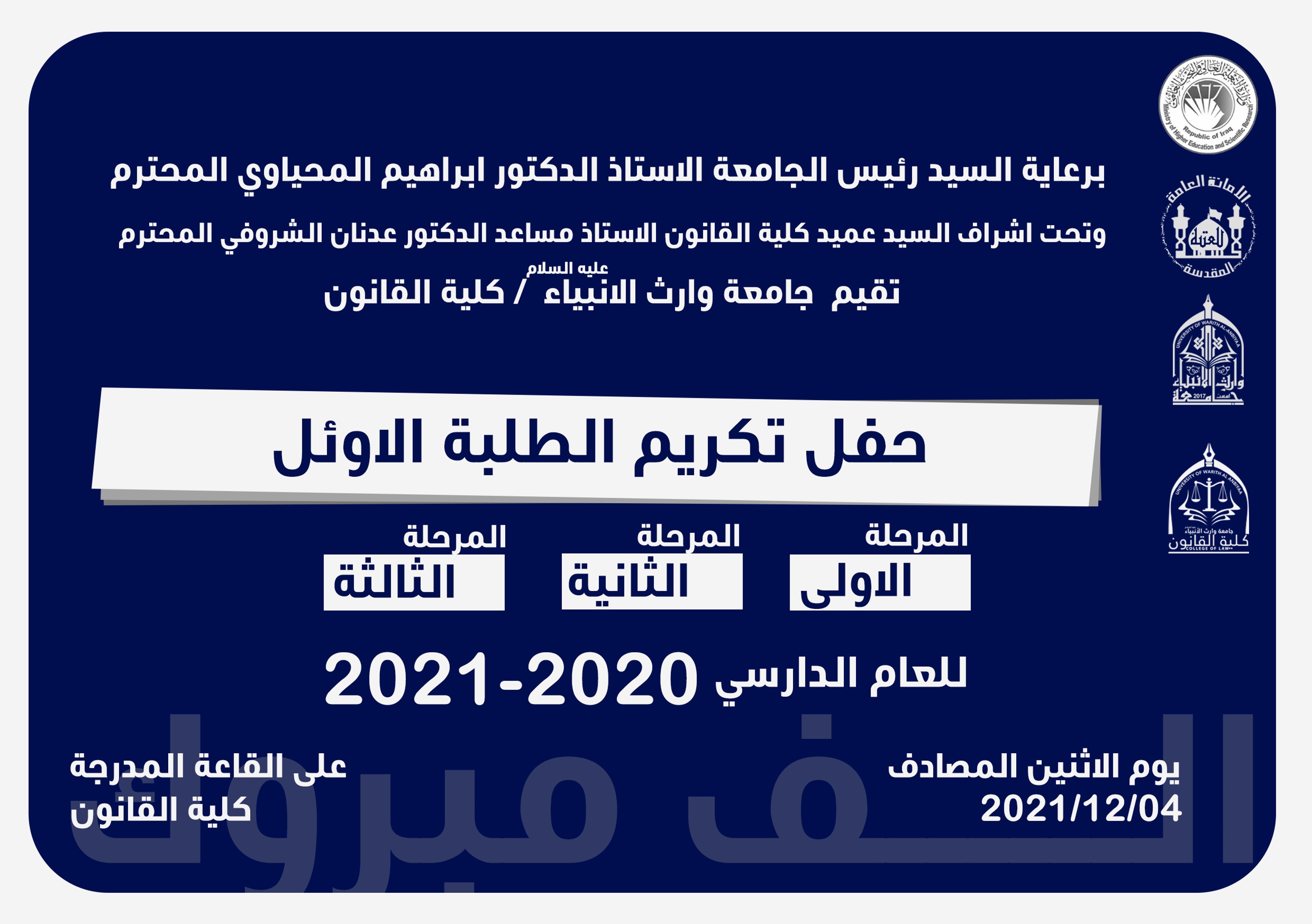 بالوقت الذي نهنئكم بحلول العام الدراسي الجديد الذي سيكون يوم غد الثلاثاء 12 /10/2021 موعدا للمباشرة بالدوام الرسمي وفق الجدول المعلن لكم بموقع التبليغات الرسمية لكليتنا ، نامل منكم المباشرة والدوام بانتظام في المحاضرات الحضورية والالكترونية والالتزام بالشروط الصحية وكل الامل بكم هو التوجه الكامل لتلقي العلم والمعرفة والالتزام بالتعليمات النافذة والإصرار على ان تكون كليتنا الحبيبة كلية القانون جامعة وارث الأنبياء في مراتب عليا من بين الجامعات العراقية في تحقيق اعلى نسب النجاح وفقا لمقاييس التقييم العلمي الوزاري وذلك تجسيدا لتوجيهات الجهة المؤسسة العتبة الحسينة المقدسة وتوجيهات رئاسة الجامعة الموقرة في تحقيق اعلى صور الرصانة العلمية و الأخلاقية .