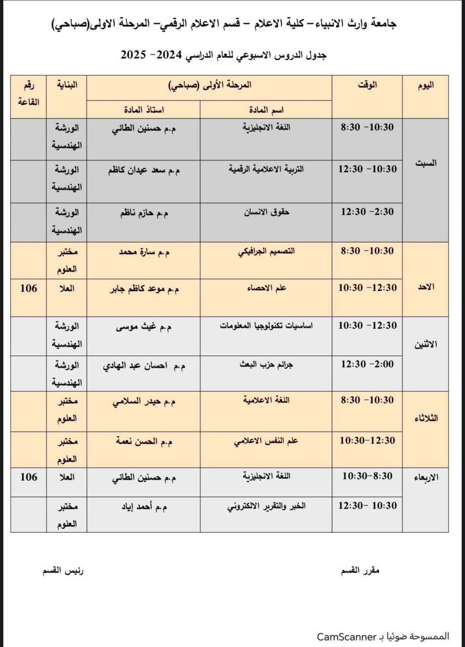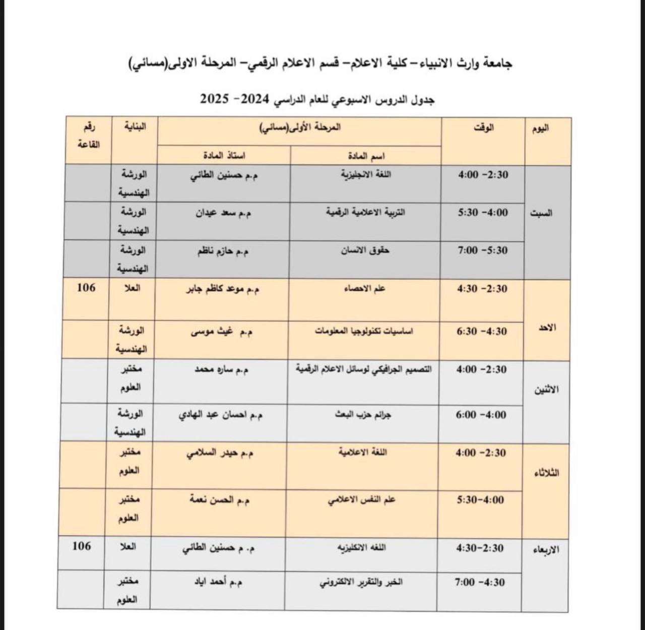 جامعة وارث الانبياء – كلية الاعلام – قسم الاعلام الرقمي – المرحلة الاولى (صباحي)