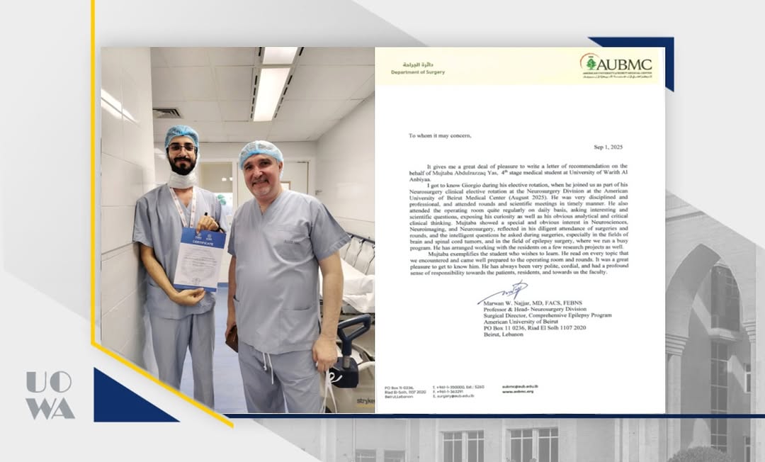 إنجاز طلابي جديد لكلية الطبتُبارك كلية الطب في جامعة وارث الأنبياء (عليه السلام) للطالب مجتبى عبد الرزاق ياس على إكماله برنامجًا تدريبيًا مكثفًا لمدة 30 يومًا في تخصص جراحة الجملة العصبية في الجامعة الأمريكية في بيروت (AUB) والمستشفى التابع لها، أحد أعرق المراكز الطبية والأكاديمية في المنطقة. تضمّن البرنامج مشاركة الطالب في الروتات الصباحية والسريرية اليومية، وحضور العمليات الجراحية المعقدة، والمشاركة في العيادات الخارجية، إضافةً إلى حضور المحاضرات النظرية والمؤتمرات العلمية مع نخبة من كوادر القسم.ويُعدّ هذا الإنجاز خطوة مهمة في مسيرة طلبتنا لتعزيز خبراتهم السريرية وصقل مهاراتهم العملية ضمن بيئات تعليمية عالمية المستوى، بما يسهم في رفع اسم جامعة وارث الأنبياء (عليه السلام) وتميّز طلبتها محليًا ودوليًا
