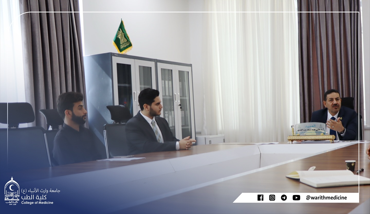 عقد السيد عميد كلية الطب في جامعة وارث الأنبياء (عليه السلام) الاستاذ الدكتور علي عبد سعدون الغزي والسيد معاون العميد للشؤون العلمية الدكتور ليث محمد عباس الحسيني اجتماعًا مع ممثلي طلبة المراحل الدراسية وذلك في إطار حرص العمادة على تعزيز التواصل المباشر مع أبنائها الطلبة والاستماع إلى آرائهم ومقترحاتهم. تضمن الاجتماع مناقشة أبرز القضايا الطلابية والأكاديمية والاستماع إلى ملاحظات الطلبة بشأن العملية التعليمية والبيئة الجامعية والعمل على تذليل الصعوبات بما ينسجم مع رؤية الكلية في توفير بيئة علمية رصينة ومحفزة على التميز.وأكد السيد العميد والسيد المعاون العلمي خلال اللقاء أن أبواب العمادة مفتوحة دائمًا أمام الطلبة وأن الكلية تولي اهتمامًا كبيرًا بصوت الطالب كونه شريكًا فاعلًا في تطوير المسيرة الأكاديمية.
