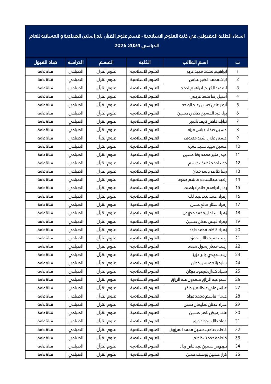 اسماء الطلبة المقبولين في كلية العلوم الاسلامية قسم علوم القرآن للعام 2024-2025 تعلن كلية العلوم الإسلامية في جامعة وارث الأنبياء (عليه السلام) عن اسماء الطلبة المقبولين في كلية العلوم الاسلامية قسم علوم القرآن كما تنوه الكلية عن موعد بدء الدراسة لطلاب المرحلة الأولى، حيث سيكون انطلاق العام الدراسي الجديد يوم السبت الموافق 7 ديسمبر 2024. ندعو جميع الطلبة الأعزاء إلى الحضور في القاعات الدراسية تمام الساعة 8:30 صباحًا، والساعة 2:00 للدراسة المسائية حيث سيتم استقبالهم والترحيب بهم من قبل عمادة الكلية والهيئة التدريسية. نتمنى لجميع الطلبة عامًا دراسيًا موفقًا ومليئًا بالنجاح والتميز.
