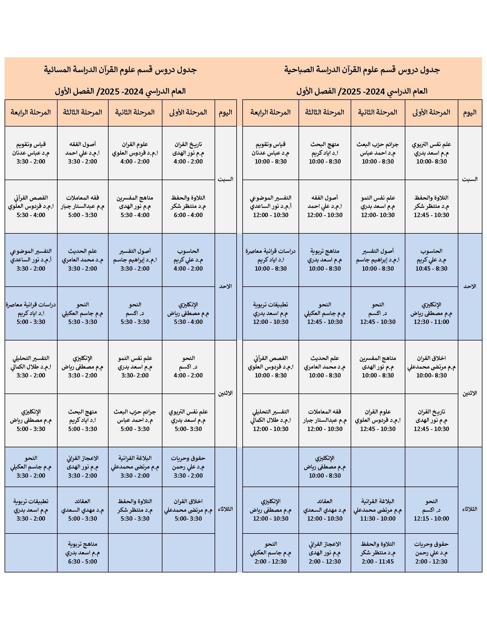 جدول امتحانات الكورس الأول قسم الفقه واصوله تعلن كلية العلوم الإسلامية في جامعة وارث الأنبياء (عليه السلام) عن انطلاق امتحانات الكورس الأول للعام الدراسي 2024-2025، وذلك ابتداءً من يوم السبت الموافق 14 ديسمبر 2024. وتتمنى عمادة الكلية لجميع الطلبة التوفيق والنجاح في أداء امتحاناتهم، مع التأكيد على الالتزام بالتعليمات الامتحانية والحضور في المواعيد المحددة لكل مادة. كما تدعو الكلية الطلبة إلى الاستعداد الجيد ومراجعة المواد الدراسية لتحقيق أفضل النتائج. ملاحظات مهمة للطلبة: - يرجى التواجد في القاعات الامتحانية قبل بدء الامتحان بوقت كافٍ. - الالتزام بإحضار الهوية الجامعية وباقي المستلزمات المطلوبة. - يُمنع استخدام الأجهزة الإلكترونية أو أي وسائل غير مسموح بها أثناء الامتحان. كل التوفيق والنجاح لطلبتنا الأعزاء!