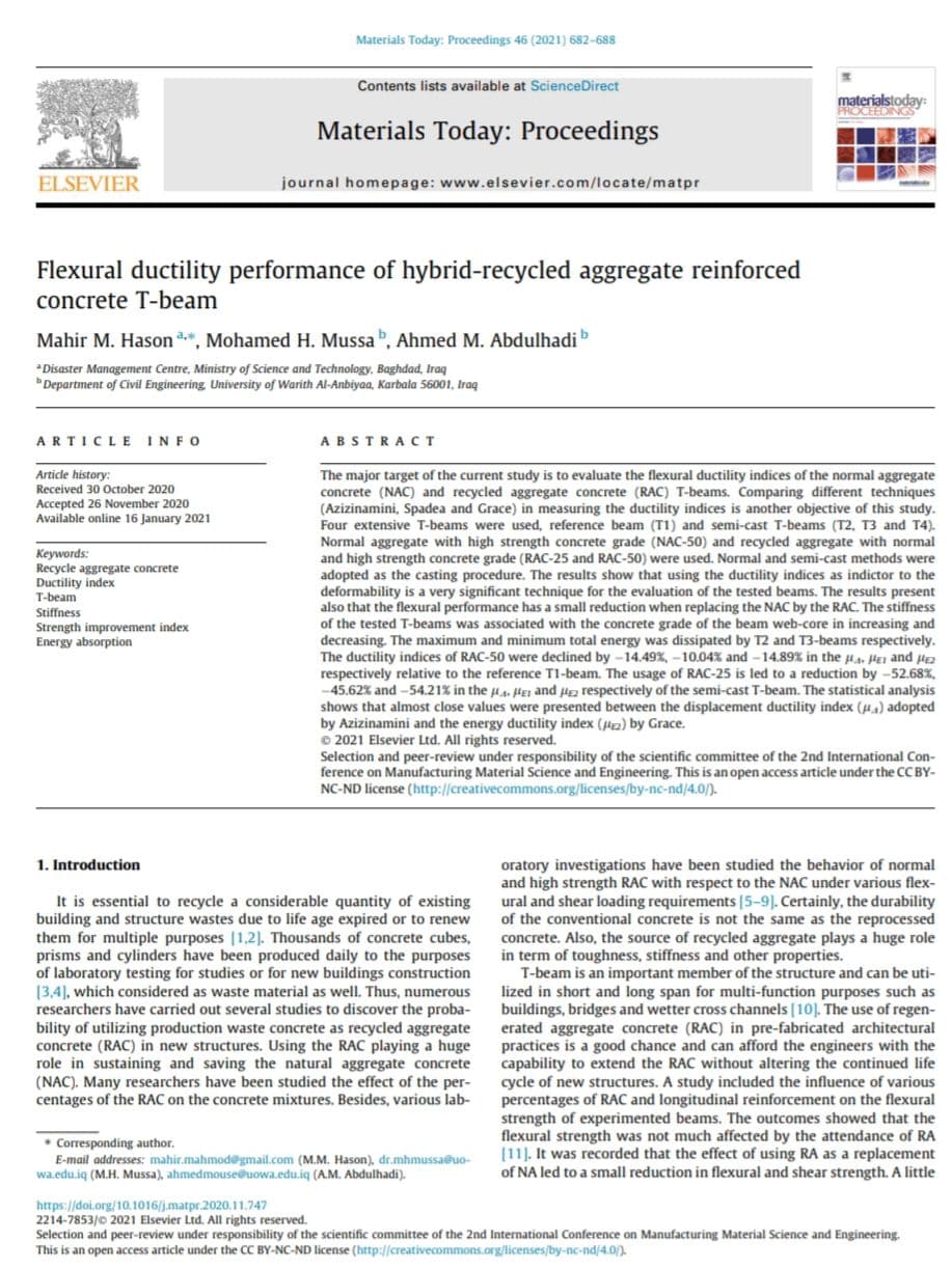 شارك الباحثان المدرس الدكتور محمد حمزة موسى والاستاذ المساعد الدكتور احمد موسى عبد الهادي التدريسيان في قسم الهندسة المدنية ببحث علمي بإسم جامعة وارث الانبياء (عليه السلام) ضمن وقائع المؤتمر الدولي الثاني للتصنيع في علوم الهندسة والمواد (ICMMSE 2020) المنعقد من قبل معهد CMR للتكنولوجيا لجامعة VTU التكنولوجية في بنغالور وقد تم نشر بحثهم الموسوم Flexural ductility performance of hybrid-recycled aggregate reinforced concrete T-beam في مجلة Materials Today: Proceedings المصنفة ضمن مستوعبات سكوباس. ويُعنى البحث بدراسة أداء ليونة الانحناء للركام المعاد تدويره من الخرسانة المسلحة على شكل حرف T. حيث أظهرت النتائج أن استخدام مؤشرات الليونة كمؤشر لقابلية التشوه هو تقنية مهمة للغاية لتقييم الحزم المختبرة وتظهر النتائج أيضًا أن أداء الانحناء له انخفاض طفيف عند استبدال NAC بواسطة RAC. يمكن الاطلاع على البحث عبر الرابط: https://doi.org/10.1016/j.matpr.2020.11.747