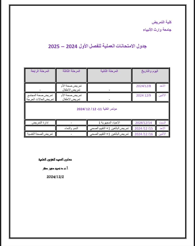 جدول امتحانات الفصل الدراسي الاول للعام 2024-2025  للمرحلة الثانية والثالثة والرابعة