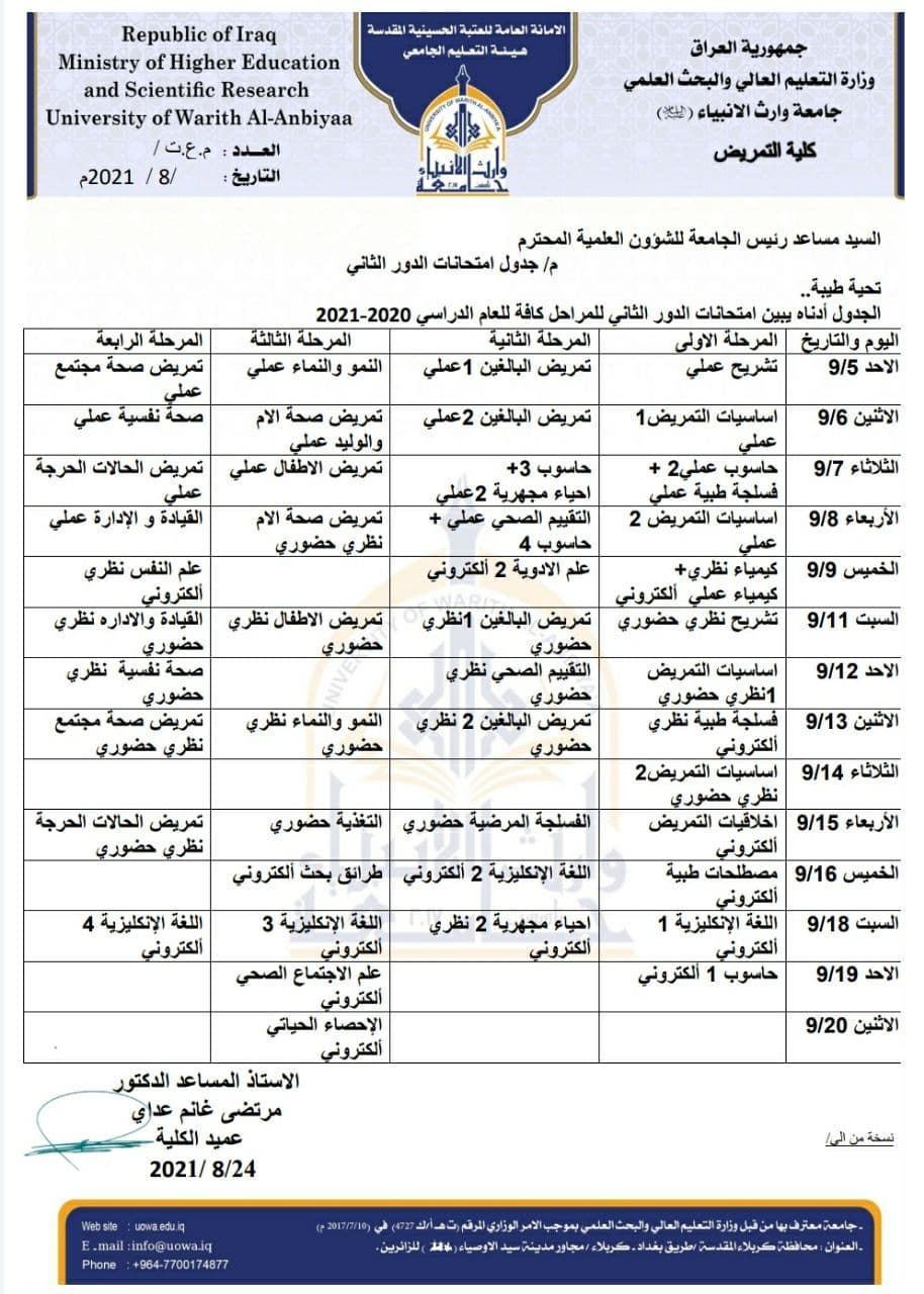 الطلبة الاعزاء - جدول امتحانات الدور الثاني لجميع المراحل مع امنياتنا لكم بالموفقية والنجاح.