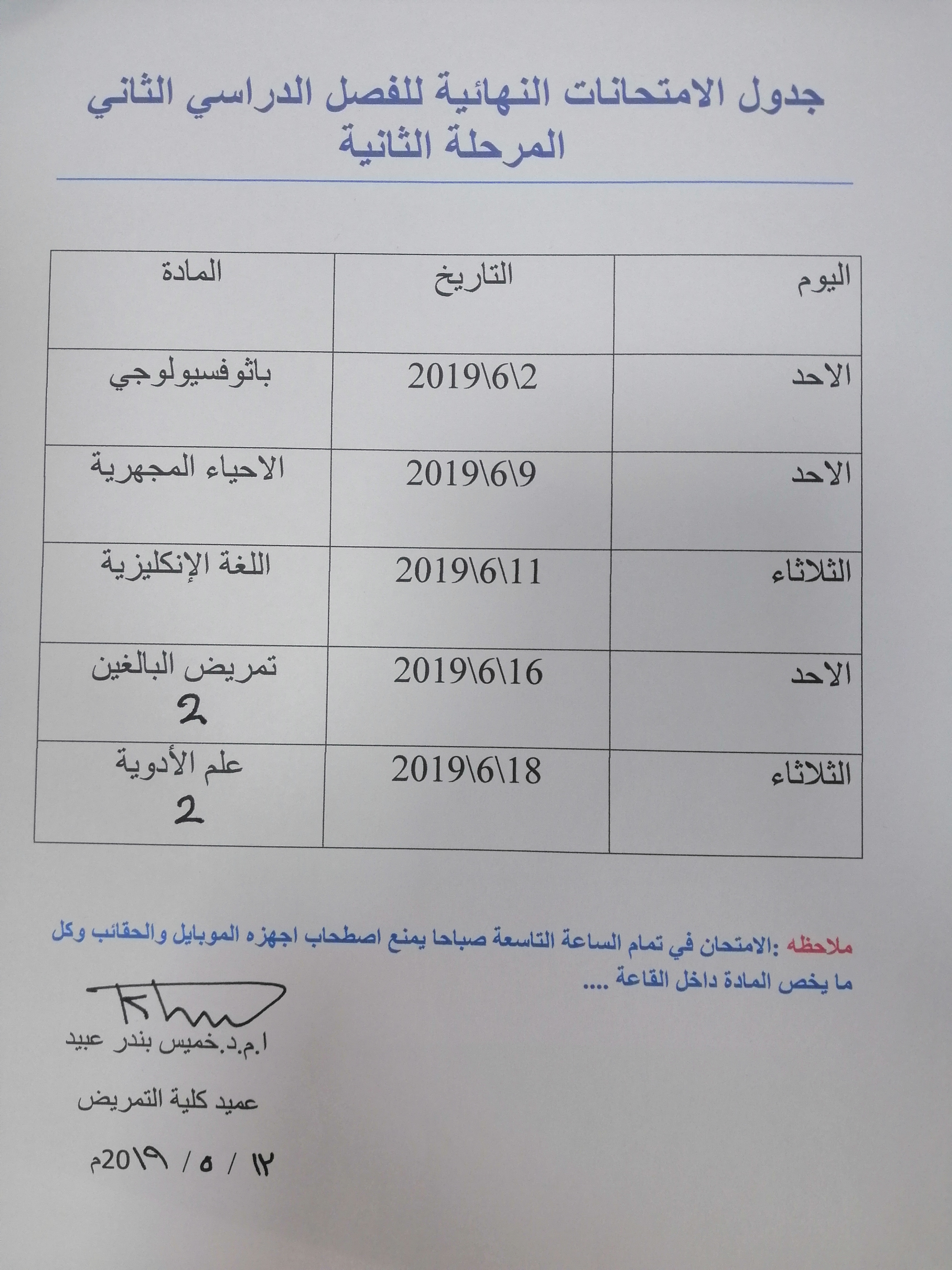 بتأريخ ٨/٥/٢٠١٩ في تمام الساعه ١٠:٣٠ص على قاعة كلية التمريض.