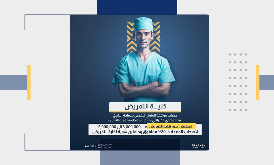 بتوجيه من العتبة الحسينية المقدسة، أعلنت رئاسة جامعة وارث الأنبياء (عليه السلام) عن تخفيض الأجور الدراسية في كلية التمريض للطلبة الحاصلين على معدل 80% فما فوق.