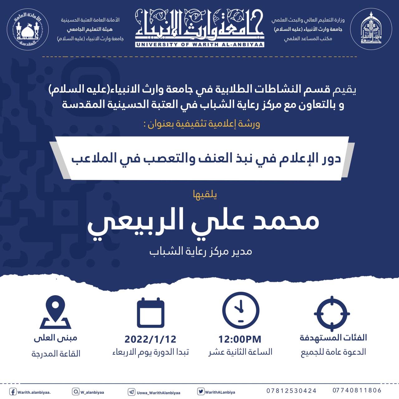 برعاية السيد رئيس الجامعة الاستاذ الدكتور ابراهيم الحياوي أقامت كلية العلوم الإسلامية في جامعة وارث الأنبياء (عليه السلام) ورشة عمل بعنوان (أثر المخدرات على الأمن النفسي والاجتماعي ومنظومة المجتمع).وحاضر في الورشة اللواء سعد معن مدير العلاقات والاعلام في وزارة الداخلية، بحضور العقيد جبار فضل سكر مدير شؤون مخدرات كربلاء، وبمشاركة شخصيات علمية واكاديمية وقال اللواء سعد معن :"يجب معرفة الآثار السلبية للمخدرات والمؤثرات العقلية لها، مع ضرورة تكاتف الجهود من أجل مكافحتها والعمل بشكل عاجل لإنقاذ المجتمع العراقي من هذه الافة التي تحمل مخاطر كثيرة أهمها انتشار الجريمة بمختلف أشكالها".