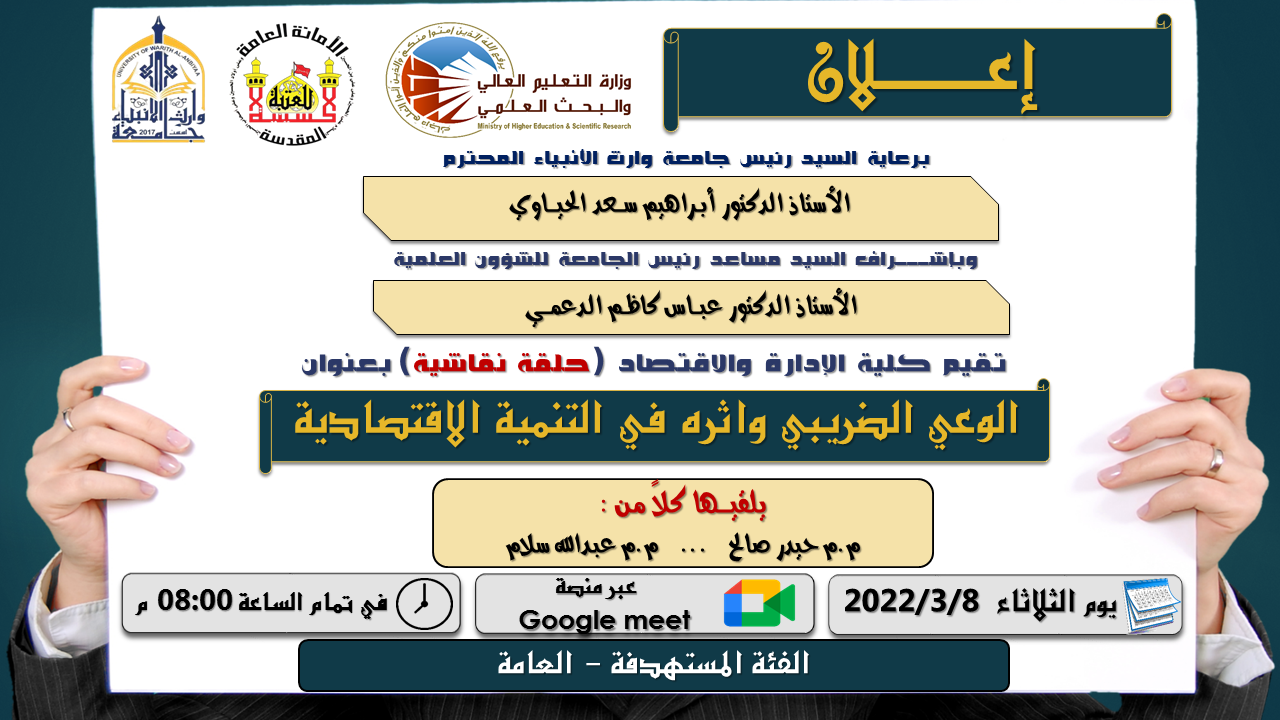 يوم الثلاثاء الموافق 8/3/2022 ، في تمام الساعة الـ 8:00 مساءً ، الفئات المستهدفة - عامة ، عبر منصة Google meet وعلى الرابط الآتي: https://meet.google.com/yux-hmeb-qxt