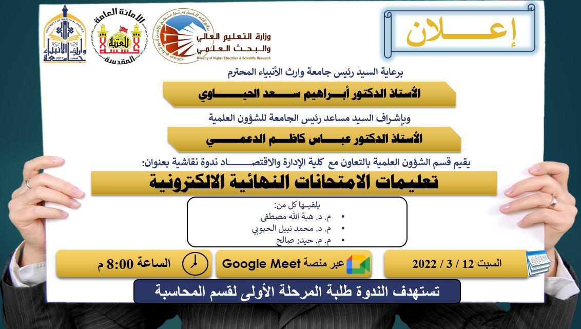 تقيم كلية الادارة والاقتصاد حلقة نقاشية بعنوان "تعليمات الامتحانات النهائية الالكترونية"، يوم السبت الموافق 2022/3/12، في تمام الساعة الـ 8:00 مساءً، والقائمين بالندوة السادة: