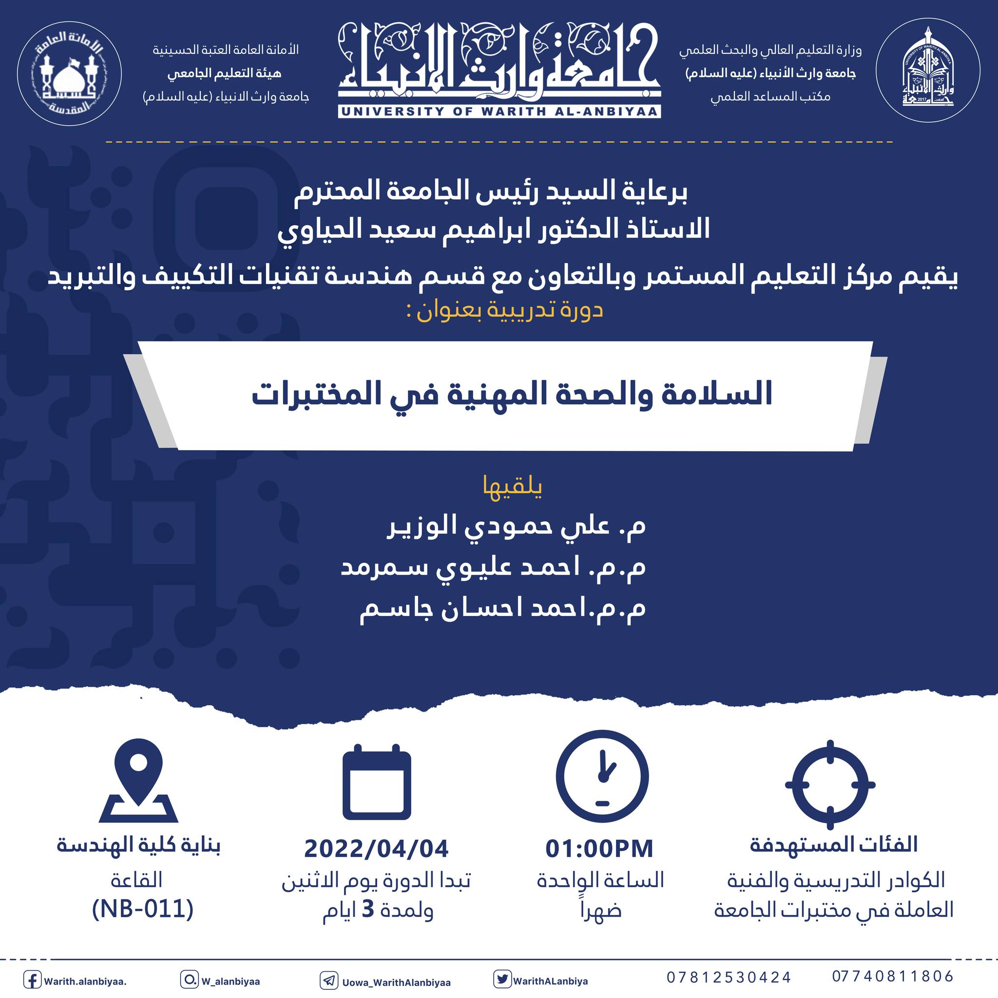 برعاية رئيس الجامعة الاستاذ الدكتور ابراهيم الحياوي نظم مركز التعليم المستمر وبالتعاون مع قسم هندسة تقنيات التبريد والتكييف دورة تدريبية بعنوان " السلامة والصحة المهنية في المختبرات "