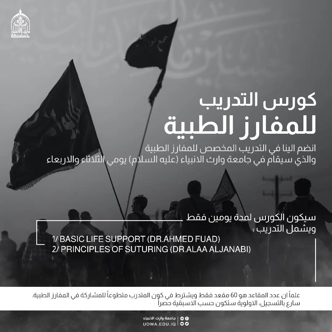 جامعة وارث الأنبياء (عليه السلام) تقييم (كورس تدريبي للمفارز الطبية) ولمدة يومين فقط في يومي الثلاثاء المصادف 18/7/2023 ويوم الأربعاء المصادف 19/7/2023 علما أن عدد المقاعد محدود جدا ما يقارب ٦٠ مقعد فقط, ويشترط في كون المتدرب متطوعاً للمشاركة في المفارز الطبية ويشمل التدريب: