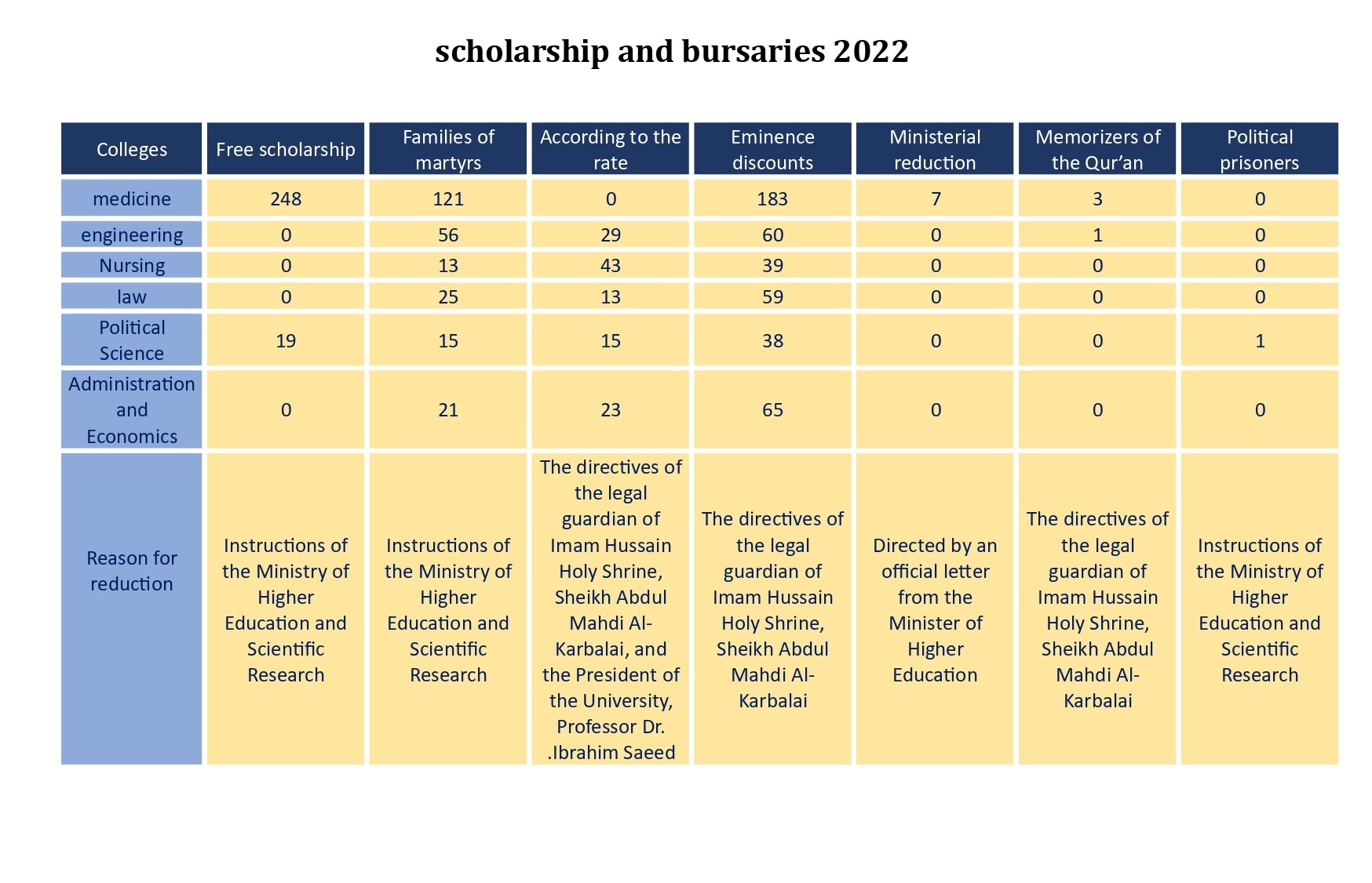 As part of this commitment we offer discounts and full scholarships to all Iraqis and non-Iraqis who meet certain criteria. These include individuals with siblings enrolled at our university, those with exceptional academic achievements, memorizers of the Holy Quran, and individuals from low-income families. We believe that education is a basic human right, and we are proud to provide individuals who deserve access to high-quality education. In view of this, the financial aid granted by the University of Heir al-Anbiya (peace be upon him) to its dear students during the year (2022) reached (four billion Iraqi dinars) (4,162,448,500).