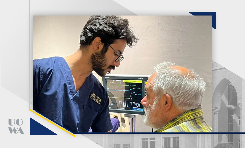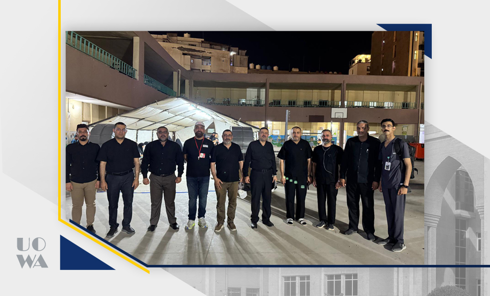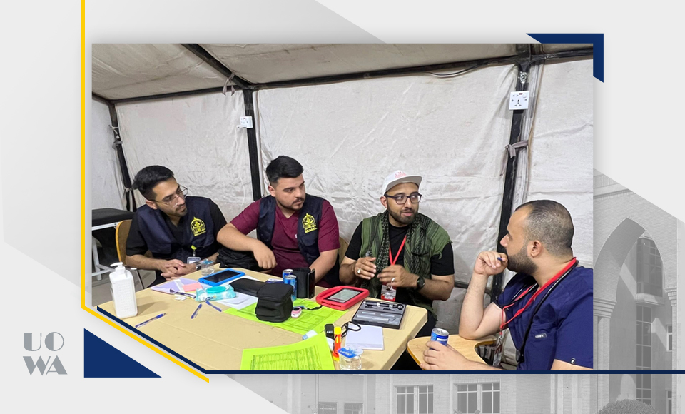 As part of the humanitarian and service role of Warith Al-Anbiya University (peace be upon him), during the Arbaeen pilgrimage, a number of students from the College of Medicine participated in providing medical and therapeutic services as part of the medical staff at the Imam Hussein Ambassador Hospital. This field participation was under the direct supervision and attendance of the Dean of the College, Professor Dr. Ali Abdul Saadoun Al-Ghazi; the Assistant Dean for Academic Affairs, Dr. Laith Muhammad Abbas Al-Husseini; and the Director of Legal Affairs, Dr. Sabah Muhammad Al-Jubouri. They inspected the work sites and learned about the nature of the services provided by the students to the honorable visitors, which included medical examinations, treatment, first aid, and health guidance services.