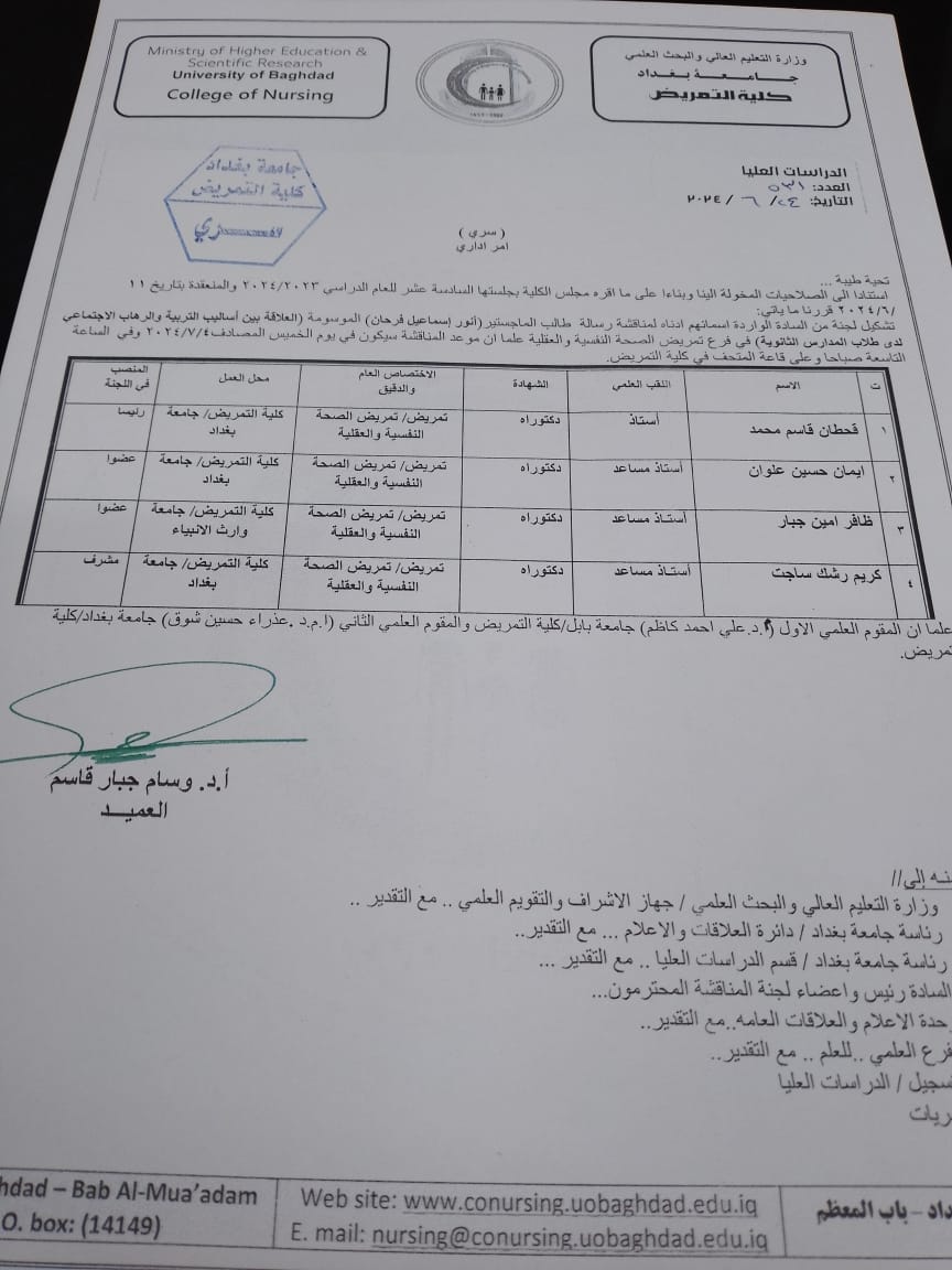 Assistant Professor Dr. Haider Mohammed Ali participated as a committee member in a master’s thesis defense at the University of Karbala.