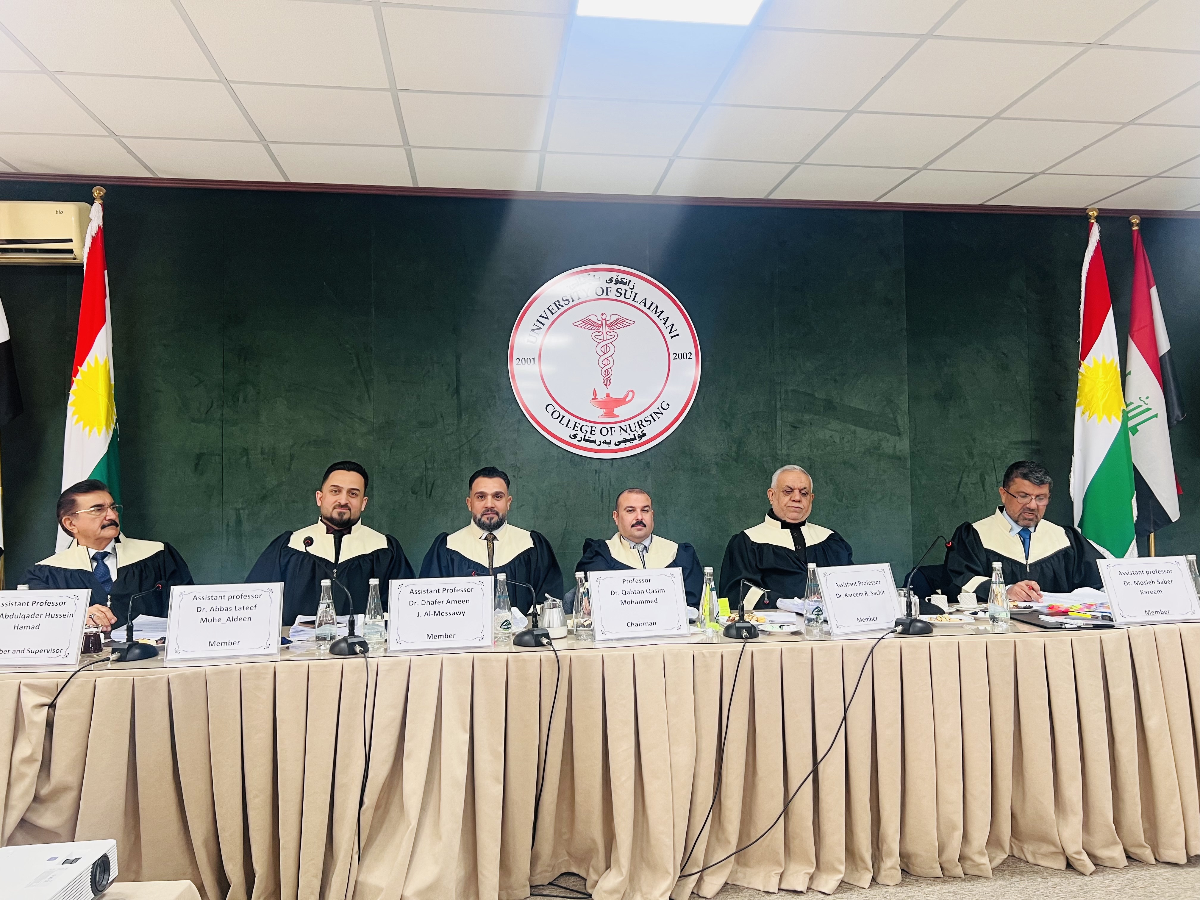 A lecturer from our university, College of Nursing (Assistant Professor Dhafer Amin Jabbar Al-Moussawi) was selected as a member to discuss the doctoral student (Lara Rashid Darwish) at the College of Nursing - University of Sulaymaniyah on her thesis entitled (The effect of the educational psychological program on the severity of symptoms among depression patients in the city of Sulaymaniyah, Iraq) on Thursday, February 27, 2025. The quasi-experimental study aimed to investigate the effect of the educational psychological program on reducing the severity of symptoms among depression patients, as well as their knowledge and commitment to treatment. The study concluded the effectiveness of the educational psychological program in reducing the severity of symptoms in patients with diseases and raising their level of knowledge and commitment to treatment through the presence of statistically significant differences in the measures used among patients in the experimental group compared to the control group. The study recommended the necessity of integrating the educational psychological program into the treatment plan for depression patients by health institutions.
