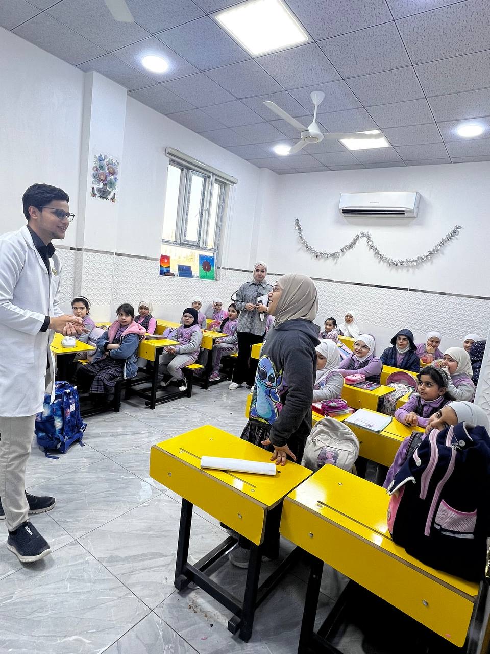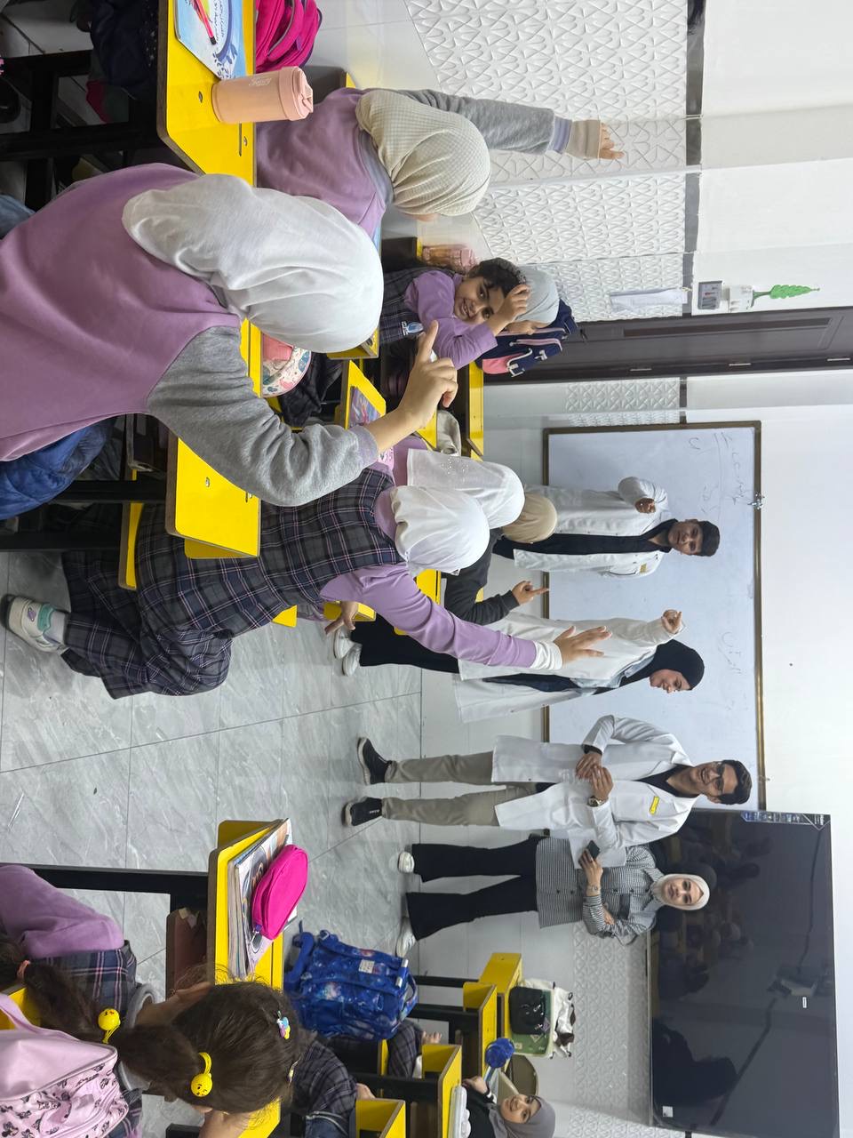 Under the direction of the esteemed Dean of the College of Nursing, Professor Dr. Murtada Ghanem Adai, fourth-year students in the Community Health Nursing Department, under the supervision of faculty members, visited Sama Al-Rayyan Elementary School as part of the practical requirements for the Community Health Nursing course. The students provided health education to the school's students on several topics, most notably proper nutrition and its impact on children's health and academic achievement. They also provided first aid, personal hygiene, the importance of handwashing, and safe play and non-harmful activities. The school environment and services provided to students were also evaluated.
