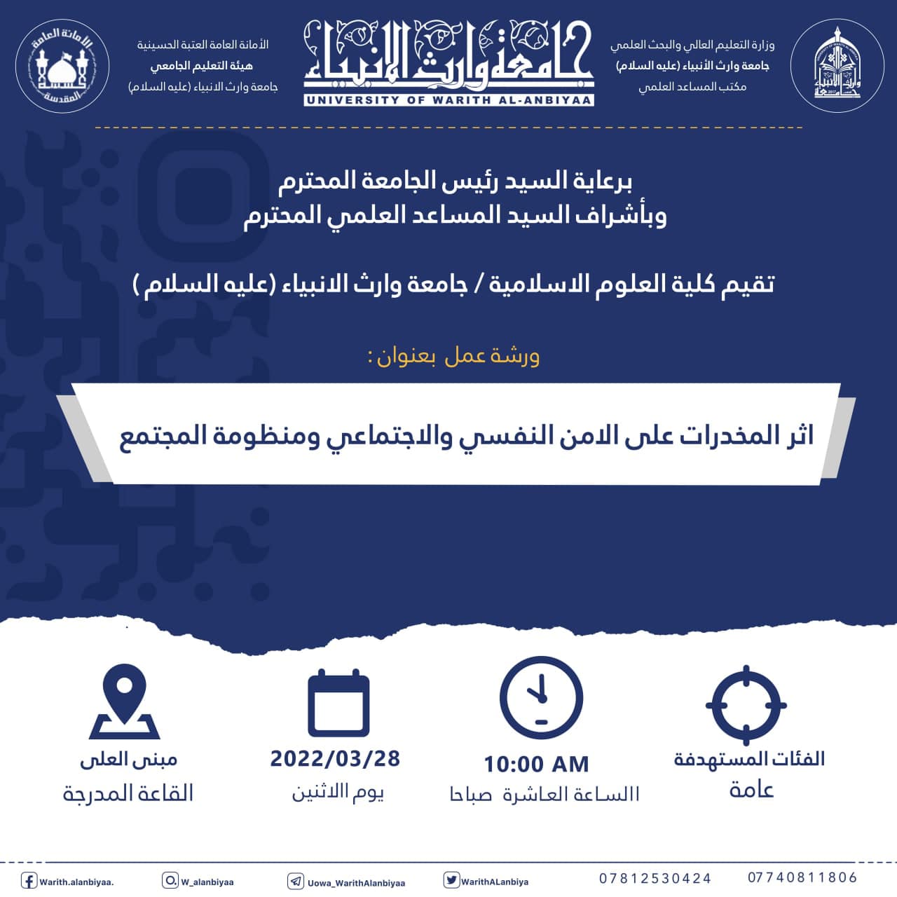 Under the patronage of the University President and the Academic Assistant, the College of Islamic Sciences at Warith Al-Anbiyaa University (peace be upon him) is organizing a workshop titled "The Impact of Drugs on Mental, Social Security, and the Social System." The workshop will be held at 10:00 AM on Monday in the auditorium located in the Al-Ali Building within the university. The invitation is open to everyone.
